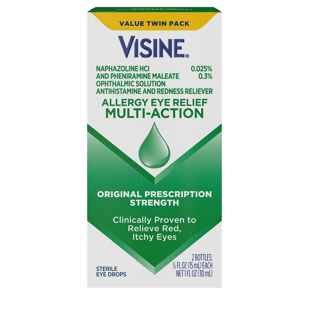 DescriptionTemporarily relieve red, itchy eyes due to allergies with Visine Allergy Eye Relief Multi-Action Eye Drops. This clinically-proven original prescription strength formula contains 0.3% pheniramine maleate, an effective antihistamine to help relieve symptoms such as red, itchy, eyes that may be irritated by common allergens such as pollen, ragweed, grass, animal hair, and dander. These multi-action allergy eye drops also contain 0.025% naphazoline hydrochloride redness reliever to provide temporary red eye relief. The small 0.5-fluid ounce bottle slips easily into a purse, pocket, backpack or desk for eye allergy relief both at home and on the go. Visine is backed by 60 years of science and expertise. Experience relief from irritated allergy eyes with Visine Allergy Eye Relief Multi-Action Eye Drops.