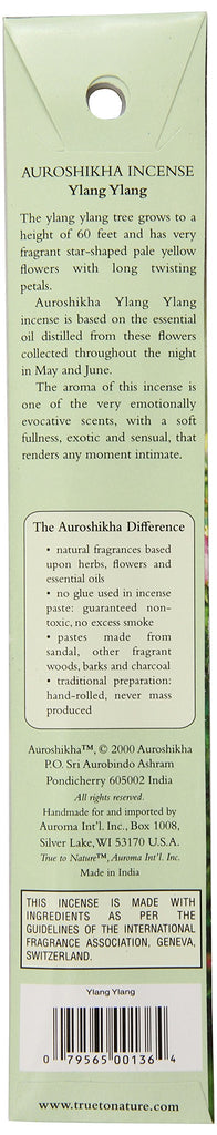 Incense Ylang Ylang 10 gram IncenseThe ylang ylang tree grows to a height of 60 feet and has very fragrant star-shaped pale yellow flowers with long twisting petals.Auroshikha Ylang Ylang incense is based on the essential oil distilled from these flowers collected throughout the night in May and June.The aroma of this incense is one of the very emotionally evocative scents, with a soft fullness, exotic and sensual, that renders any moment intimate.The Auroshikha Difference natural fragrances based upon herbs, flowers and essential oils no glue used in incense paste: guaranteed nontoxic, no excess smoke pastes made from sandal, other fragrant woods, barks and charcoal traditional preparation: hand-rolled, never mass producedDirections Light end and then blow out until the tip burns red. Set incense in holder and let burn.Other Ingredients: THIS INCENSE IS MADE WITH INGREDIENTS AS PER THE GUIDELINES OF THE INTERNATIONAL FRAGRANCE ASSOCIATION, GENEVA, SWITZERLAND.Warnings: Keep out of reach of children. As with all dietary supplements, consult your healthcare professional before use. See product label for more information.