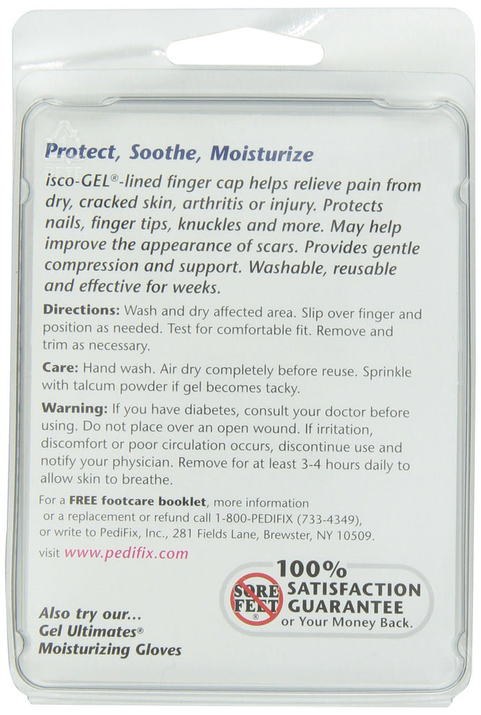 Visco-GEL-lined finger cap helps relieve pain from dry, cracked skin, arthritis or injury. Protects nails, finger tips, knuckles and more. May help improve the appearance of scars. Provides gentle compression and support. Washable, reusable and effective for weeks.