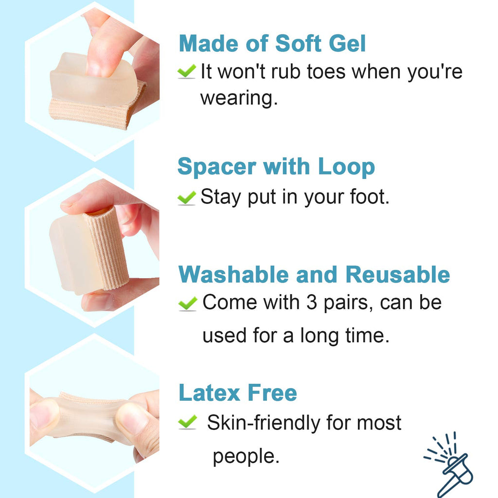 • Q: How do I use the toe spacers correctly? A: To use the toe spacers, simply place them between your toes and adjust until they fit comfortably. It is recommended to wear them with snug-fitting socks and shoes for the best results.