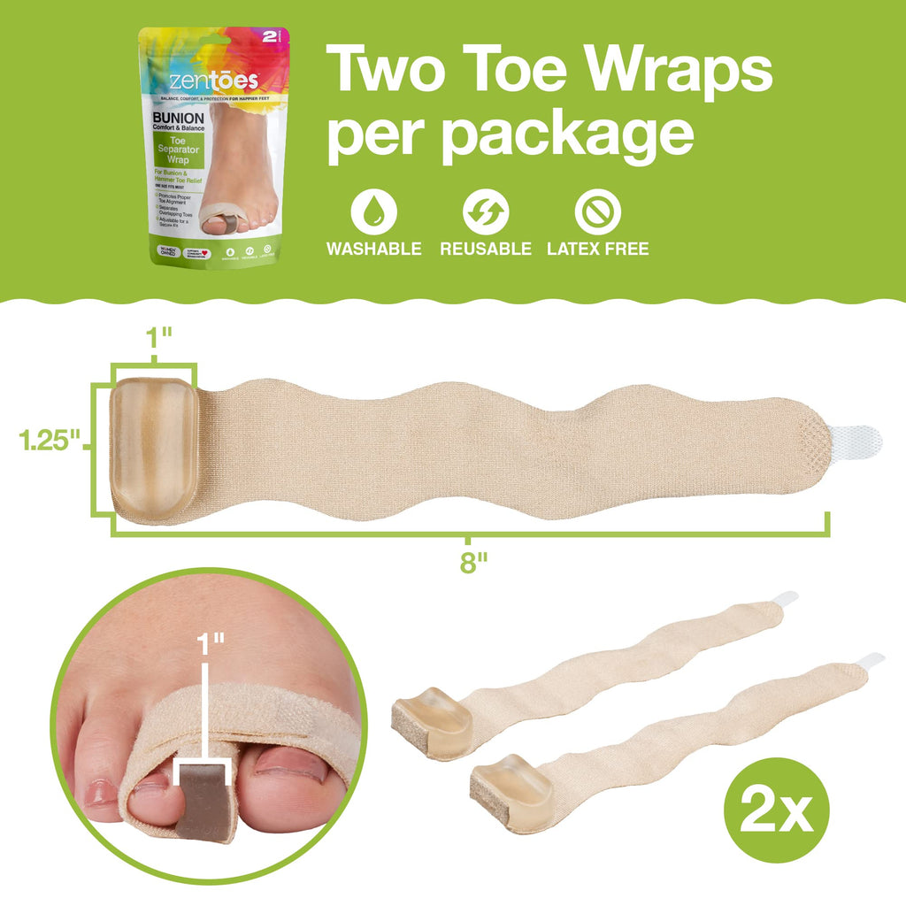 Get relief today from bunion pain, hammertoes, and crooked and overlapping toes with ZenToes Bunion Toe Spacer Wrap. Our unique design secures the soft gel toe spacer between your big and index toes, providing pain relief from bunions, while still being comfortable and easy to use. At ZenToes we strive to provide the highest quality foot care treatments available. Our premium foot care products are made from medical grade materials to ensure that you receive superior products for your feet. Live an active, balanced lifestyle when you trust your foot care to ZenToes. This product has been prepared for shipment with dignity and purpose by an individual with diverse abilities who works at Opportunities, Inc. in Wisconsin. When you purchase this product, you support your feet and a good cause!
