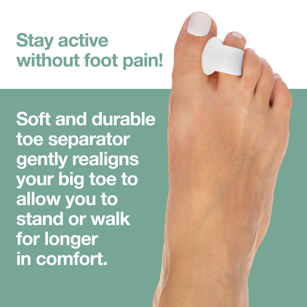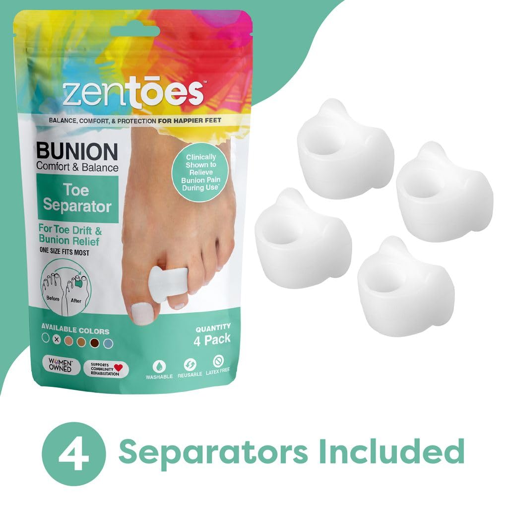 Are your feet feeling happy? If you suffer from toe overlap, a bunion or toe drift, its likely your feet are achy, stiff or suffering from irritation right this very minute. But they dont have to be! The way to transform painful feet to happy ones is a simple silicone ring--the ZenToes Silicone Toe Spreader and Toe Separator. With this easy-to-use foot care solution, you can finally take every step in comfort to complete your daily activities. Our toe separator is designed to be worn over the second toe like a ring. Once its in place, a flexible, supportive silicone pad stays comfortably against your big toe. Instantly, toe overlap problems are corrected, and you dont have to worry about blisters or calluses forming on that sensitive skin between your toes. Not just a toe spacer for managing toe overlap, this toe separator can solve problems associated with a bunion and toe drift, too. With the toe spreader in place, your big toe will stay in proper alignment, helping to keep the sides of your shoes from rubbing on it during the day. Re-positioning your big toe with the toe separator stretches the underlying tissue as well, reducing aching and strain. With its unique design, our toe spreader and separator is a discreet solution for a bunion, toe drift or toe overlap. You can comfortably wear the toe spacer under nearly all types of shoes, so you wont have to leave those dressy men's oxfords or that cute pair of pumps in the closet. The toe spreader is made to fit most adult feet for easy shopping! At ZenToes we strive to provide the highest quality foot care treatments available. Our premium foot care products are made from medical grade materials to ensure that you receive superior products for your feet. Trust your foot care to ZenToes.