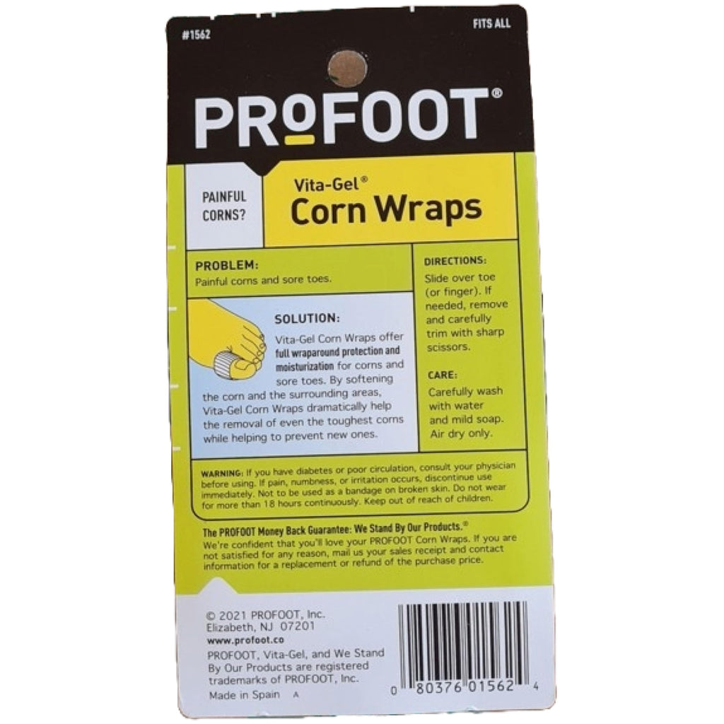 • Q: What are ProFoot Vita-Gel Corn Wraps used for? A: ProFoot Vita-Gel Corn Wraps are designed to provide cushioning and moisturization for toes, helping to relieve pain associated with corns and calluses.
