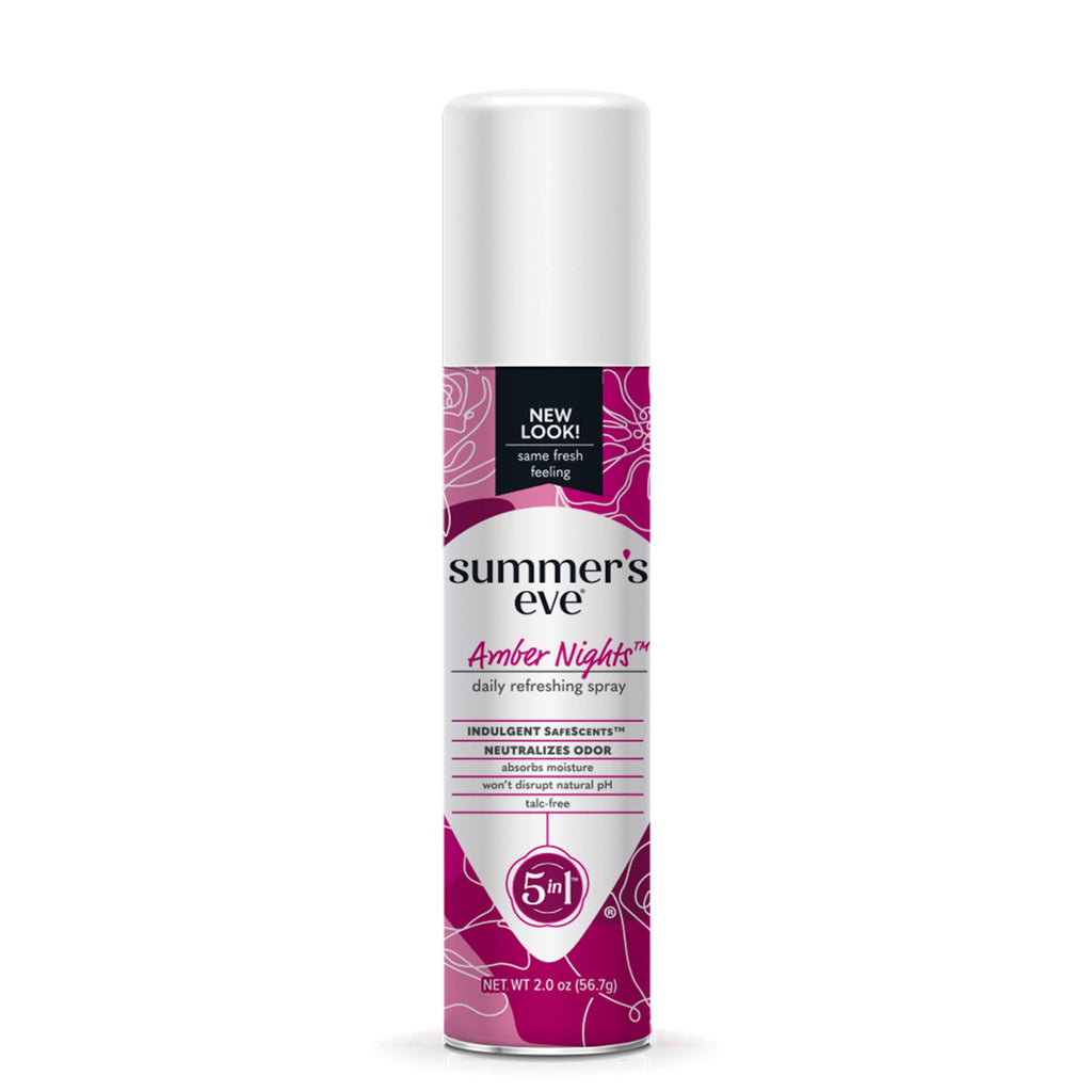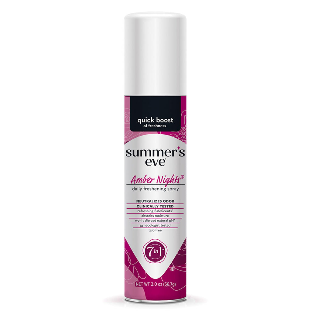 • Q: What is Summer's Eve Amber Nights Daily Refreshing Feminine Spray? A: Summer's Eve Amber Nights Daily Refreshing Feminine Spray is a 2 oz refreshing spray designed for intimate areas, formulated to neutralize odor while being gentle on delicate skin.