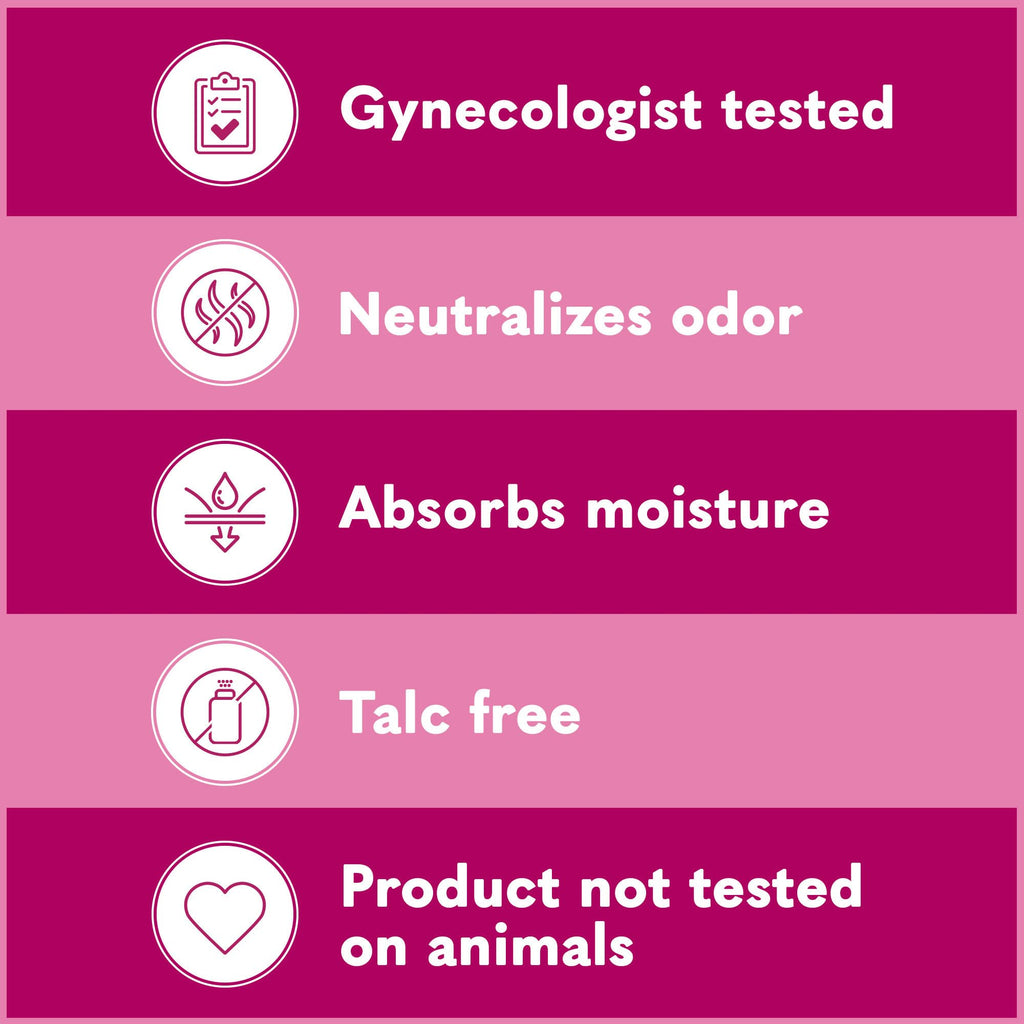• Q: What are the key features of this product? A: Key features include odor neutralization, a refreshing experience, talc-free formulation, and gynecologist-tested safety for delicate skin.