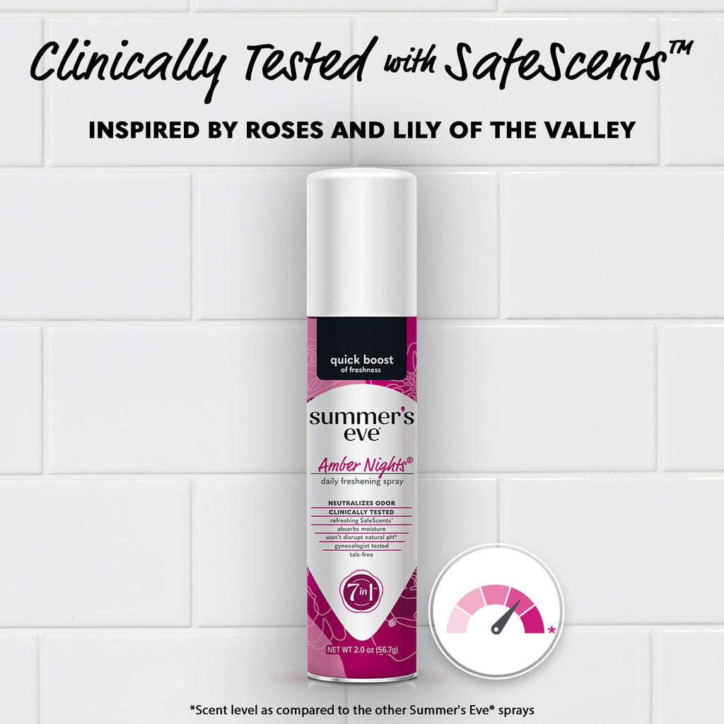 • Q: Is Summer's Eve Amber Nights suitable for daily use? A: Yes, this feminine spray is designed for daily use to help maintain freshness and comfort.