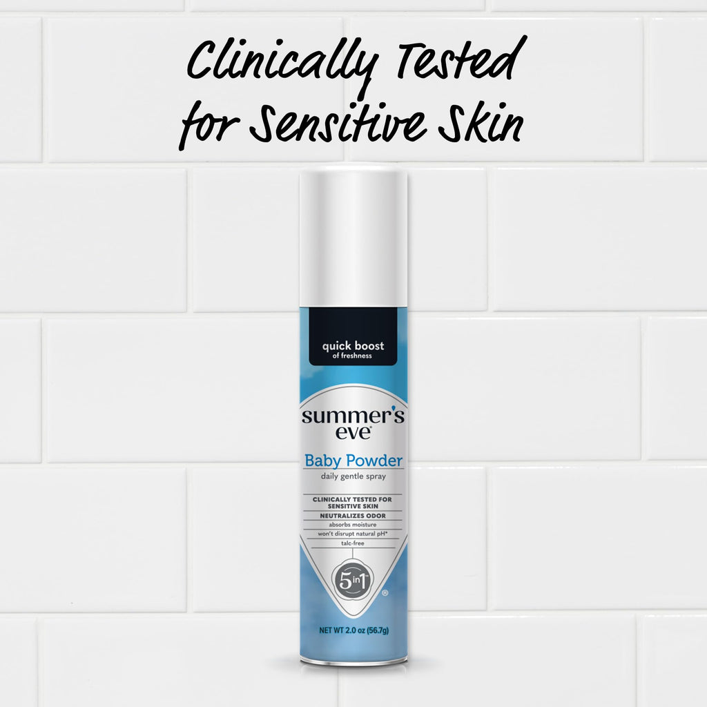 • Q: Is this feminine spray safe for sensitive skin? A: Yes, Summer's Eve Baby Powder Spray is gynecologist tested and formulated to be gentle enough for sensitive skin.