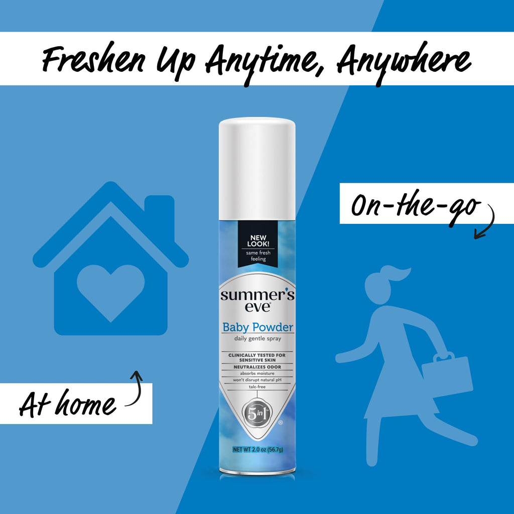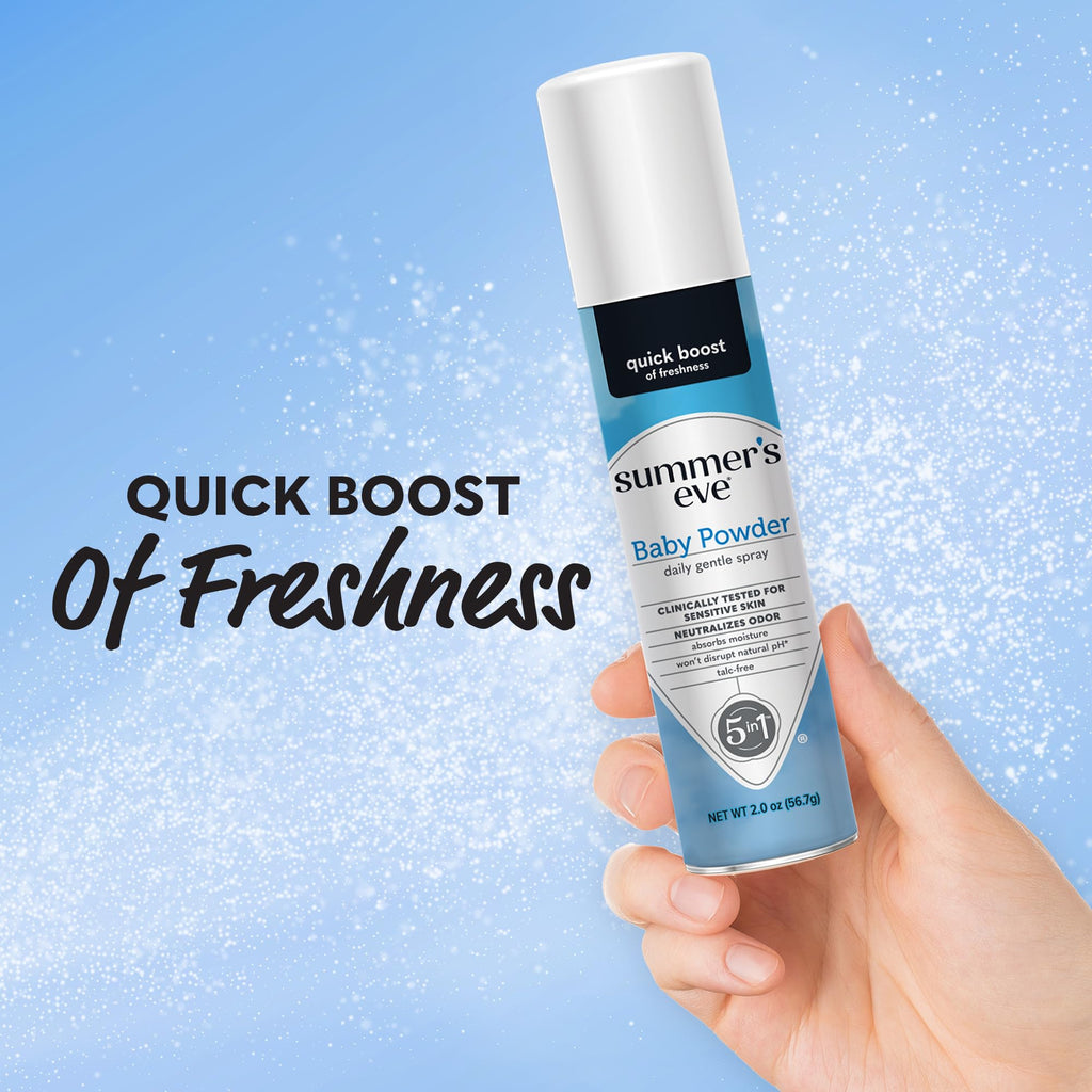 • Q: How often should I use this product? A: You can use Summer's Eve Baby Powder Spray daily, applying it in the morning for a fresh start or throughout the day as needed.