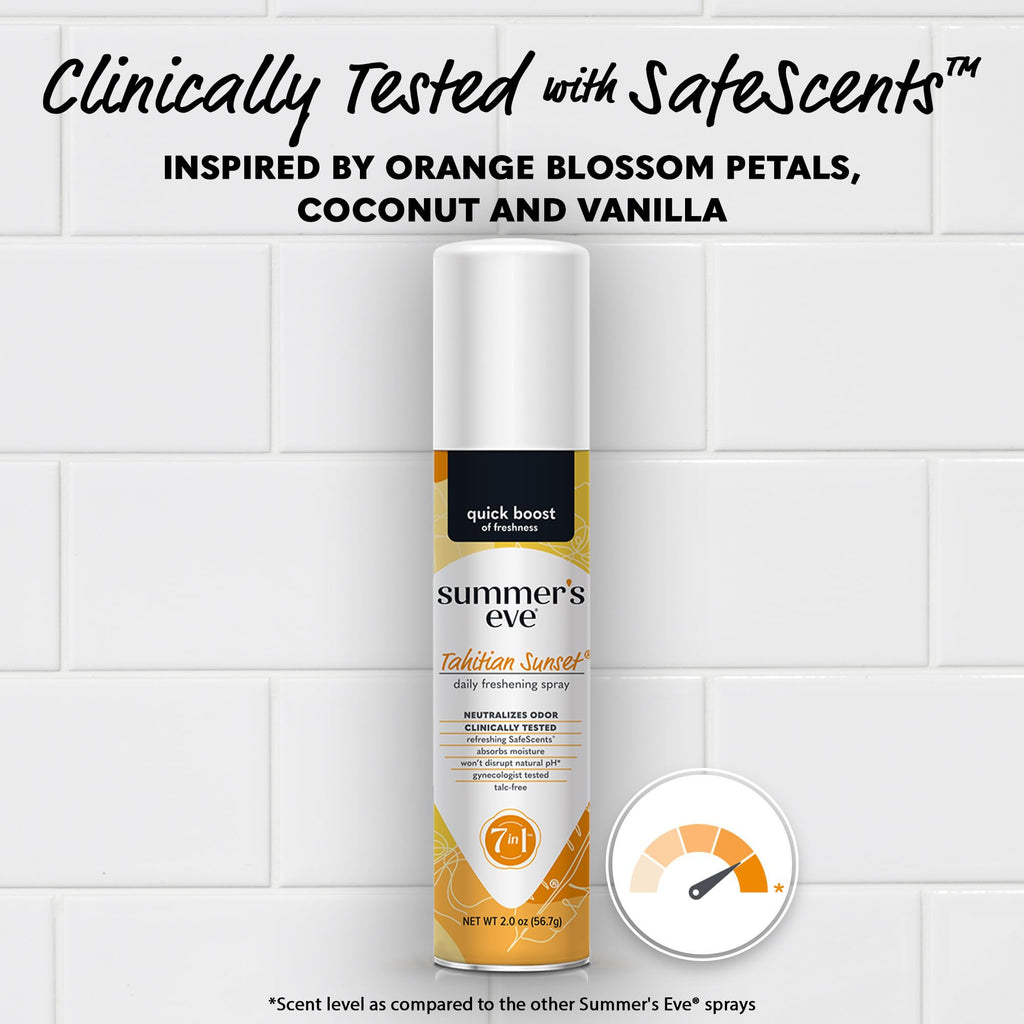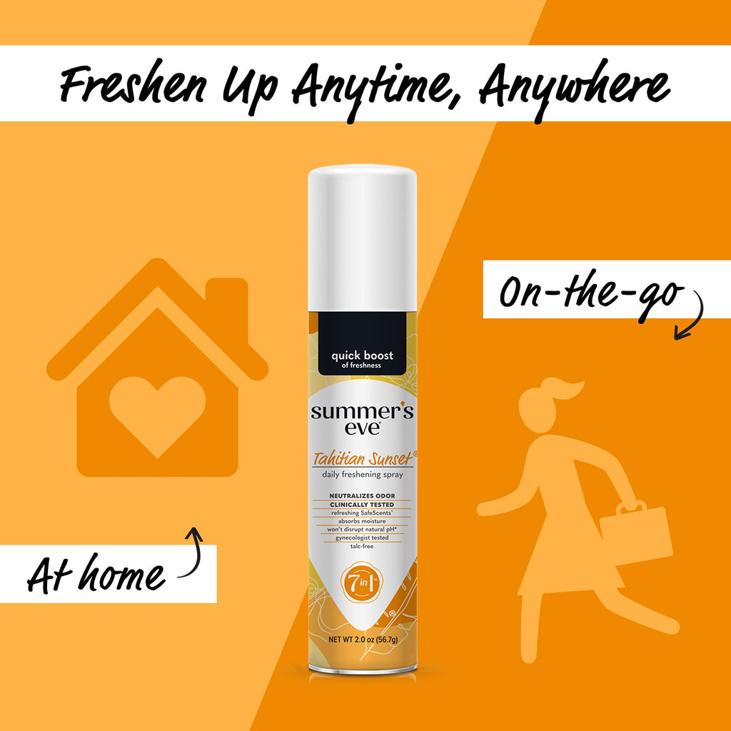 Find your fresh with Summer's Eve Feminine Freshening Spray. Summer's Eve Feminine Freshening Spray is hypoallergenic, and safe and gentle enough to use every day. Free from talc, Summer's Eve Feminine Freshening Spray is designed to absorb moisture and neutralize odor, and will not disrupt a womans natural pH range. All Summer's Eve products - along with every unique scent - are gynecologist-tested to ensure they are safe, even for sensitive skin. Tahitian Sunset is a fragrance that is inspired by orange blossom petals, coconut and vanilla. Summer's Eve Feminine Freshening Spray is available in a variety of different fragrances. Be sure to check out Summer's Eve Feminine Cleansing Washes and Cleansing Cloths for all your feminine cleansing needs.