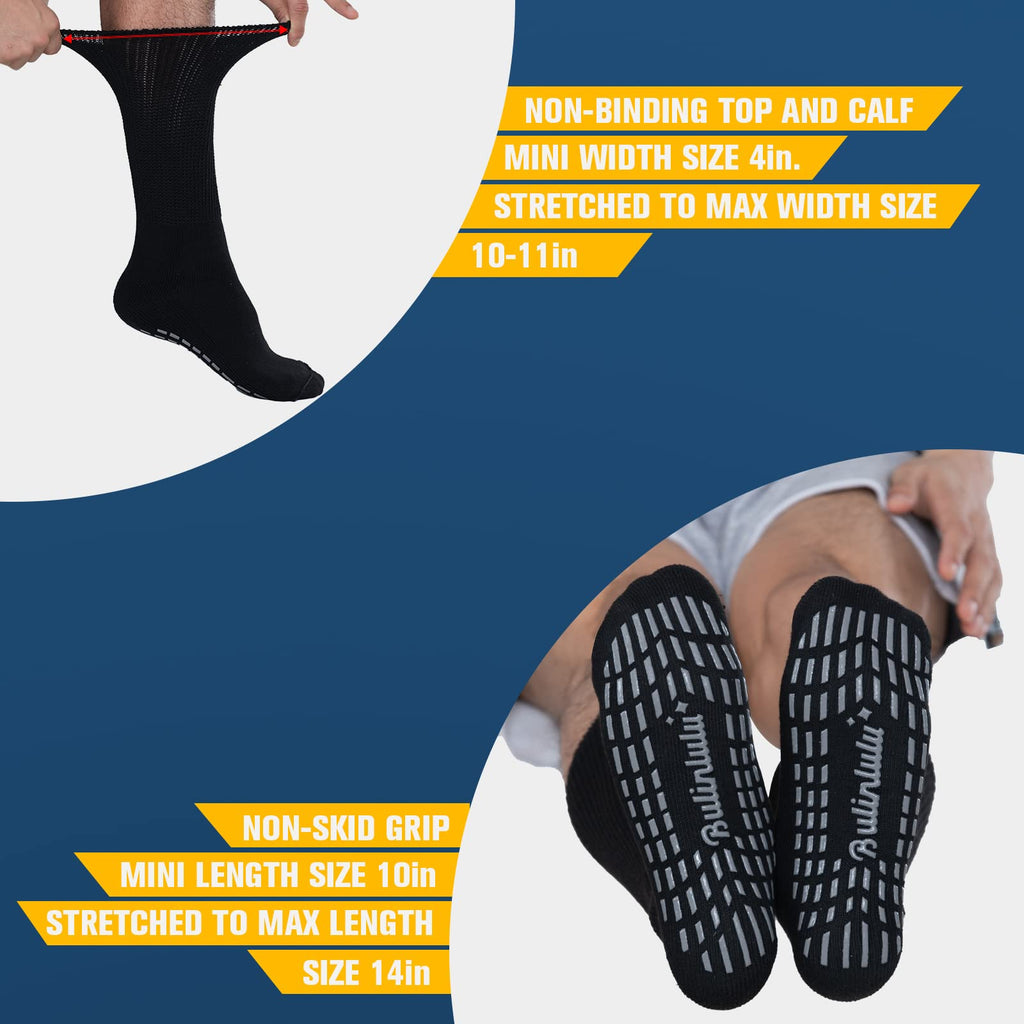 Extra Wide Diabetic Socks -Extra wide bariatric socks are different from normal diabetic socks The top of bariatric socks can stretches up to 30 wide and the socks with thicker footbed design, you will not feel cold on sole Edema socks can help you reduce the pain from ankles, swollen feet ,or large calves resulting from lymphedema and similar conditionOur socks have an anti-shedding design at the top , preventing socks slip down around your ankles effectively after wearing it for a while Hospital Socks with grips fit all sizes Hospital large socks fit all sizes-This no binding extra wide cast sock with high quality elasticIt accommodates feet of all sizes and provides perfect coverage and comfort both for usersOne Size Unisex and fits from Mens 10-13 and 13-15,Womens 7-9 and 9-16 Our stretchy bariatric compression socks help you maintain normal blood circulation while making your every step comfortable and less painful Extra Wide Socks for Swollen Feet and ankles- Edema socks with non-skid grippers, avoiding the dangers of slipping while walking The medical cast socksAinverted toe seam cover design will not hurt or irritate your toes We use the low composition cottons and high composition polyester As a professional medical slipper socks, we clearly know that cotton with moisture-absorbing effect, but without wicking Patients need keep their feet dry,so high composition polyester will be better Super Wide Edema Socks - Our non skid bariatric socks has moisture-wicking effect unlike regular plus size non slip bariatric socks Our extra wide diabetic edema socks also suit for Lymphedema drainage ,Edema,cast, Bariatric,Swollen feet Patients Who wearing a cast also is especially suitable for our extra wide lymphedema socks Extra Wide Mens Socks: Having a cast on your foot, ankle or leg used to mean trying to find a way to keep your toes warm These oversized bariatric compression socks must be your best choicesOrder these oversized medical socks for yourself or as a thoughtful present for your friends who need these