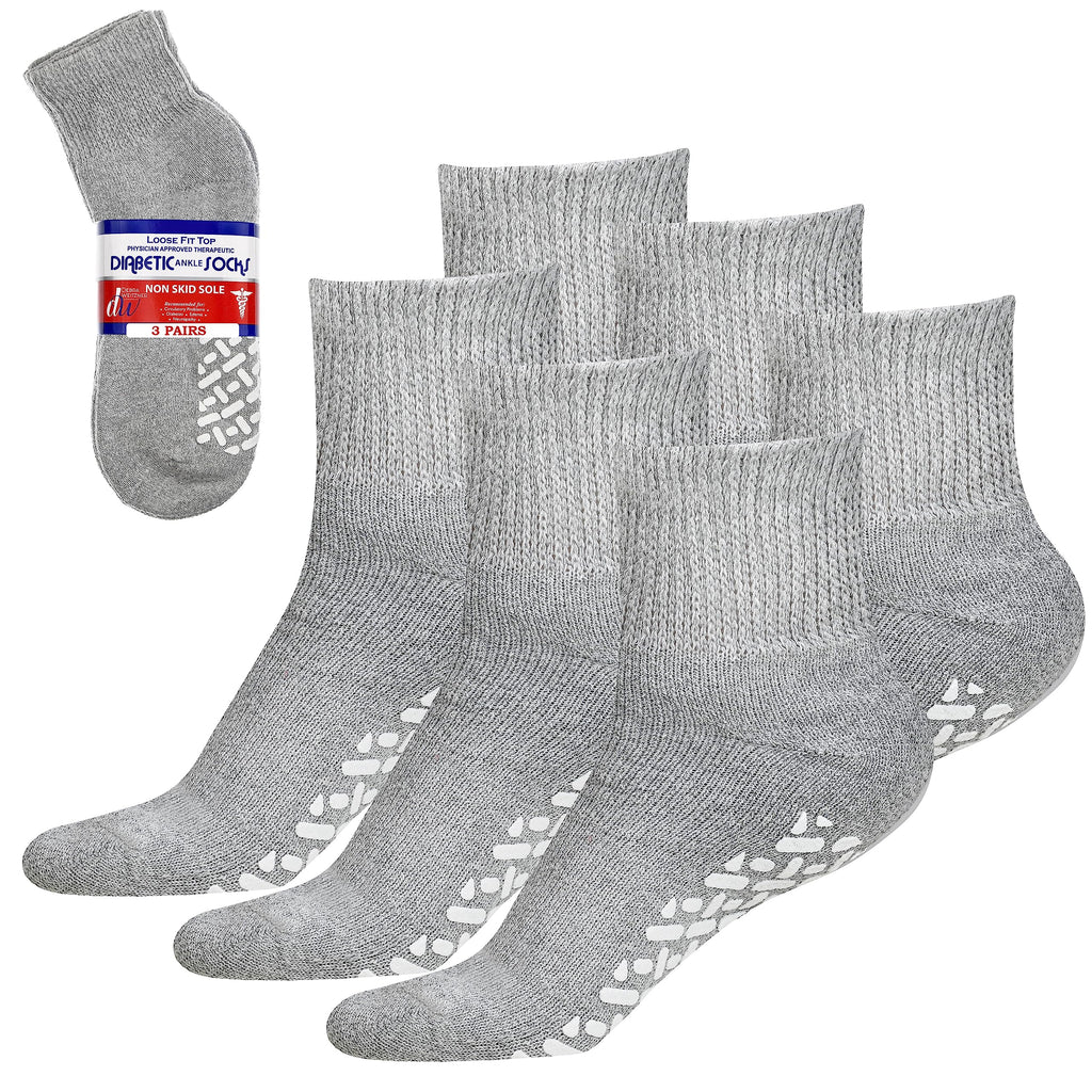 3 pairs of top-quality non skid diabetic Crew or ankle socks with loose fitting, non-binding top for maximum comfort. Made of breathable cotton material, these therapeutic medical socks work great to improve blood circulation and are highly recommended for diabetes, edema, and neuropathy. These affordable physician approved socks will keep your legs healthy and comfortable. The non slip treads on bottom of these diabetic socks make it a safe choice to use as hospital socks or for the frail and elderly.