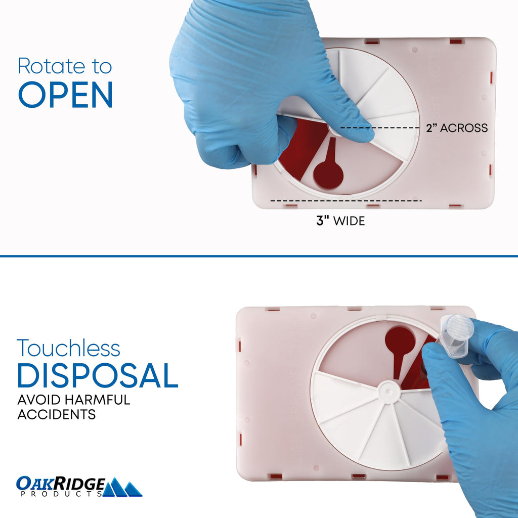 OakRidge Products 2.2 quart sharps container with rotary lid. Puncture-resistant, transparent body allows for easy viewing. Designed for use as a transportable container with rotating lid to allow for safe disposal of larger sharps - includes needle unwinder. Horizontal drop maximizes usable container volume for larger sharps. Locks for final disposal.