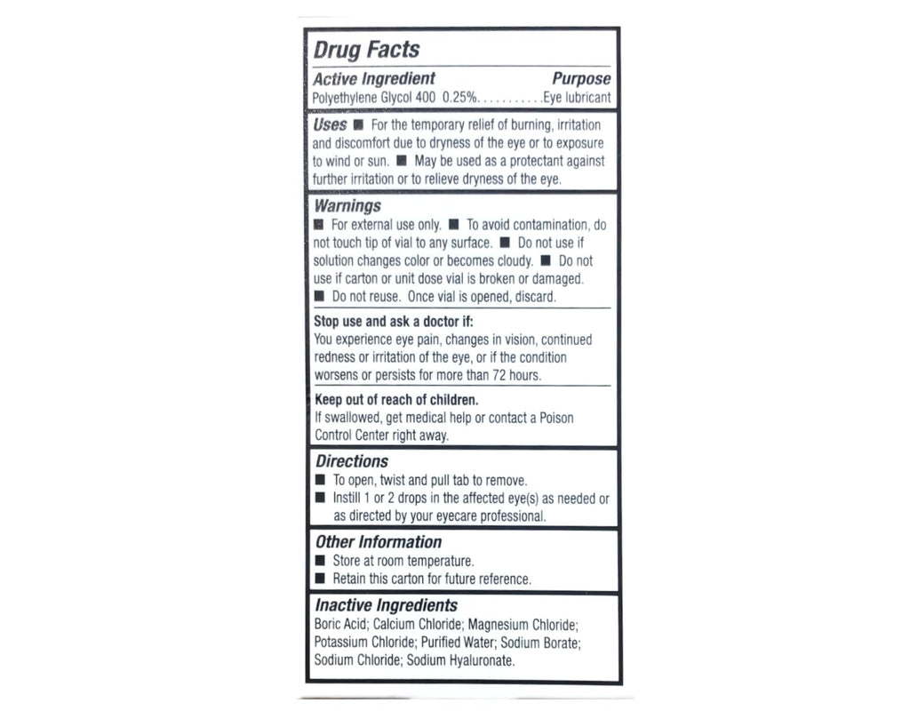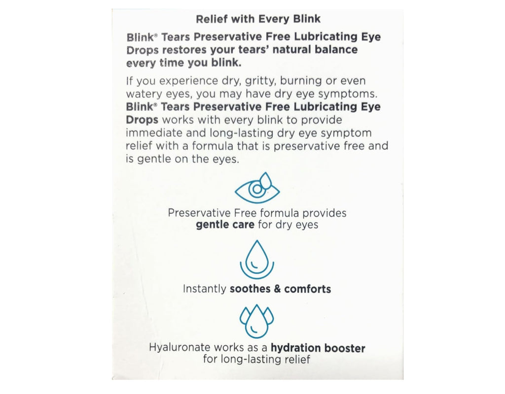 Blink Tears Dry Eye Lubricating Eye Drops in Single Use Vials are designed for mild to moderate dry eye symptoms. Experience immediate and long-lasting dry eye symptom relief. Blink's unique gentle, preservative free formulation maximizes hydration and helps restore your tears natural balance, providing long-lasting dry eye symptom relief. The sterile, single use vials can easily be carried in a pocket or purse, for on-the-go soothed, hydrated eyes. Simply twist and pull the tab to instill 1 to 2 drops in each eye. Experience moisturized eyes with Blink, because your eyes deserve the best.