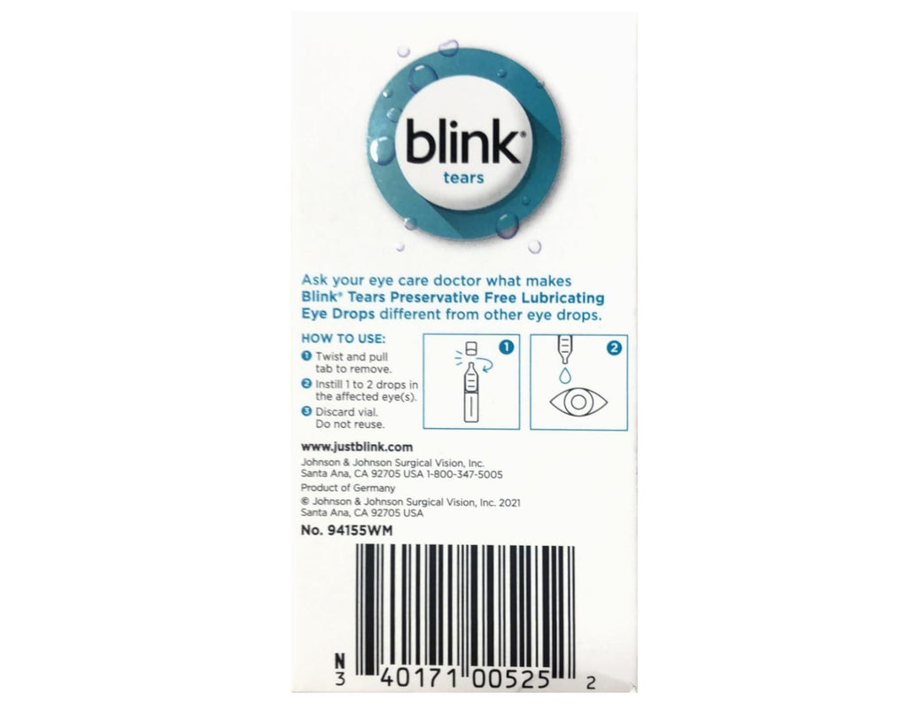 Blink Tears Dry Eye Lubricating Eye Drops in Single Use Vials are designed for mild to moderate dry eye symptoms. Experience immediate and long-lasting dry eye symptom relief. Blink's unique gentle, preservative free formulation maximizes hydration and helps restore your tears natural balance, providing long-lasting dry eye symptom relief. The sterile, single use vials can easily be carried in a pocket or purse, for on-the-go soothed, hydrated eyes. Simply twist and pull the tab to instill 1 to 2 drops in each eye. Experience moisturized eyes with Blink, because your eyes deserve the best.