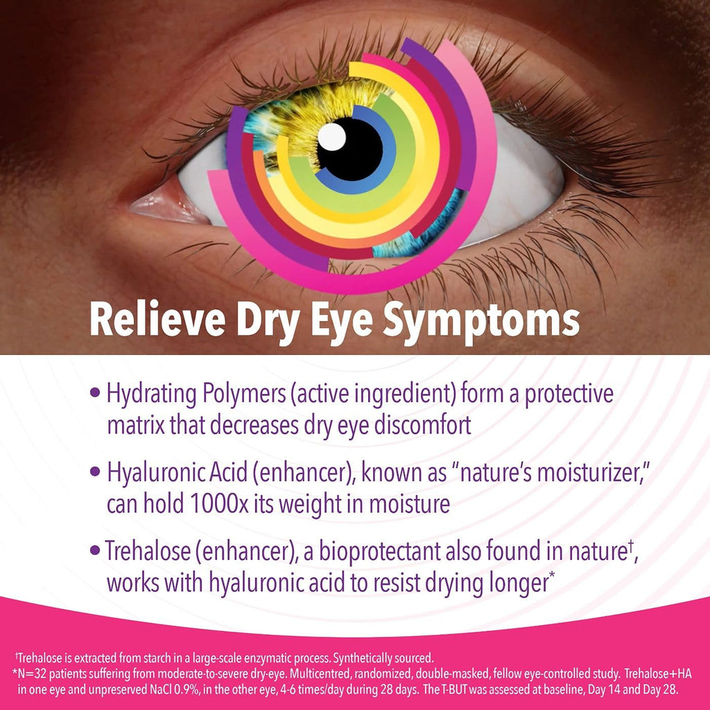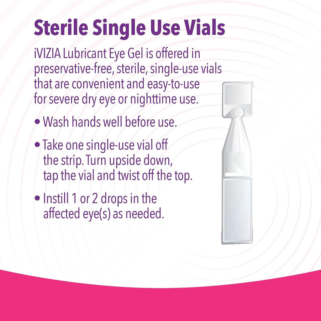 Your dry eyes deserve better. iVIZIA Lubricant Eye Gel for severe and nighttime dry eyes is scientifically formulated to relieve dryness, discomfort, and eye strain. Made with hydrating polymers that form a protective matrix over your eyes, moisturizing hyaluronic acid, and revitalizing trehalose, our gel is a thicker formula for overnight use and provides more lubrication and moisture to dry eyes than our daytime formulation. iVIZIA Lubricant Eye Gel for Severe or Nighttime Dry Eyes is preservative-free, safe to use pre or post-surgery. iVIZIA - We See a Better Way. (Source: Prescription market data, Sept. 2021 - S01K without cyclosporine)