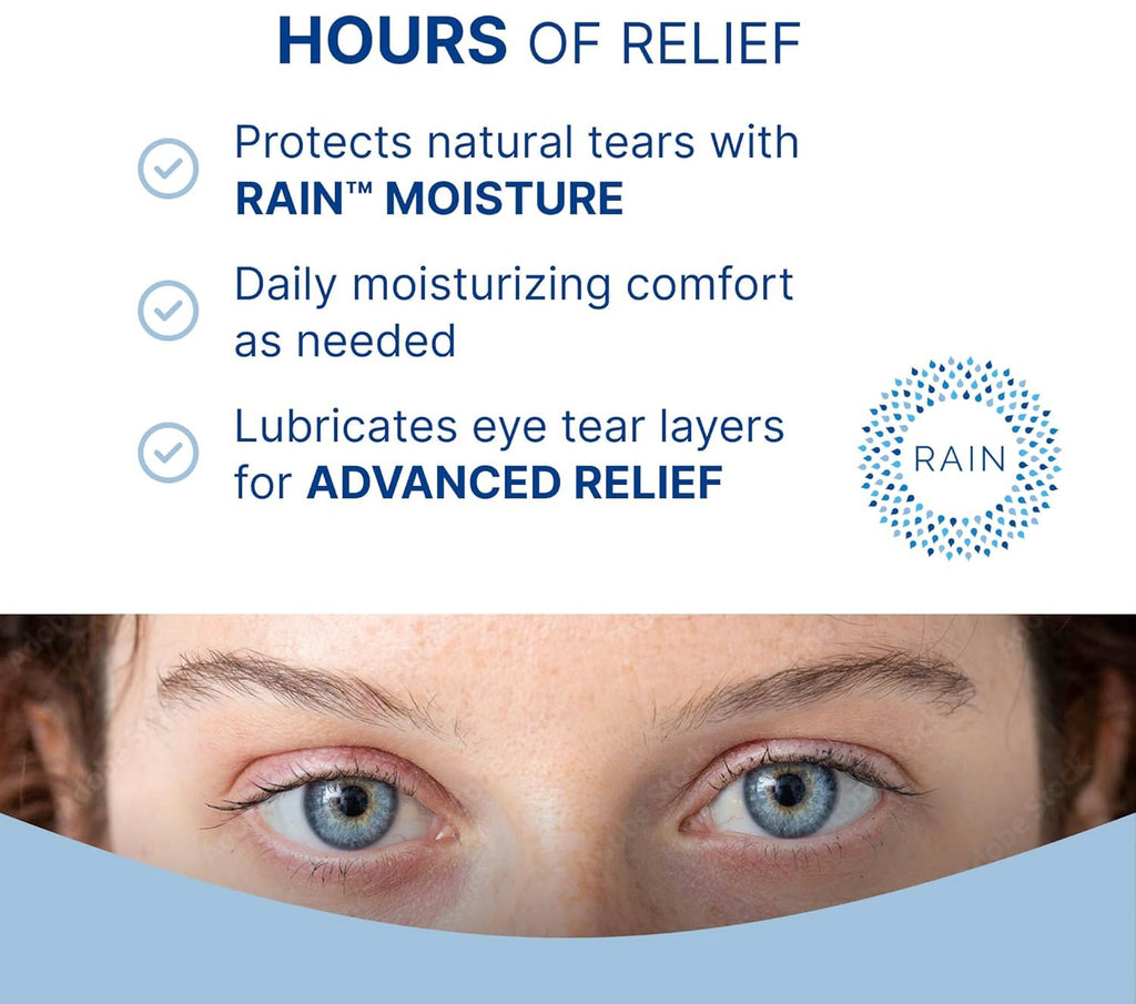 Experience the ultimate eye comfort with Rain preservative free lubricating eye drops. Our advanced formula, enriched with the innovative CMS eye moisture technology, is specifically designed to tackle moderate to severe dry eye conditions, providing long-lasting relief and unparalleled comfort. Suitable for daily use and contact lens wearers, these drops offer the perfect balance of hydration and soothing relief. The preservative-free nature of Rain eye drops makes them ideal for individuals with sensitive eyes. Our unique CMS eye moisture ingredient works to mimic the natural hydration of tears, delivering effective moisture and relief without the harshness of chemicals or preservatives. This innovative approach ensures that your eyes remain comfortable, hydrated, and free from irritation. Whether you're facing the everyday challenges of screen time, environmental factors, or simply seeking relief from persistent dryness, Rain eye drops are your solution. They're not just artificial tears; they're a step towards restoring your eyes' natural moisture balance. Try Rain for a refreshing experience that brings lasting comfort to your eyes, all day, every day.