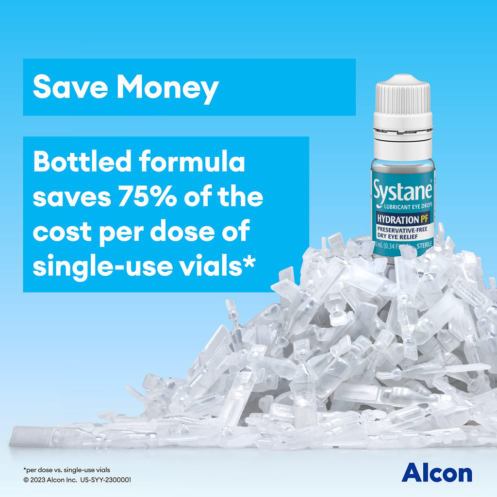 Systane Hydration lubricant eye drops are clinically proven to deliver extended protection and high-performance dry eye symptom relief that lasts. Systane Hydration lubricating eye drops serve as a protectant against further irritation. Find relief from your dry eye symptoms with soothing comfort and added moisture.