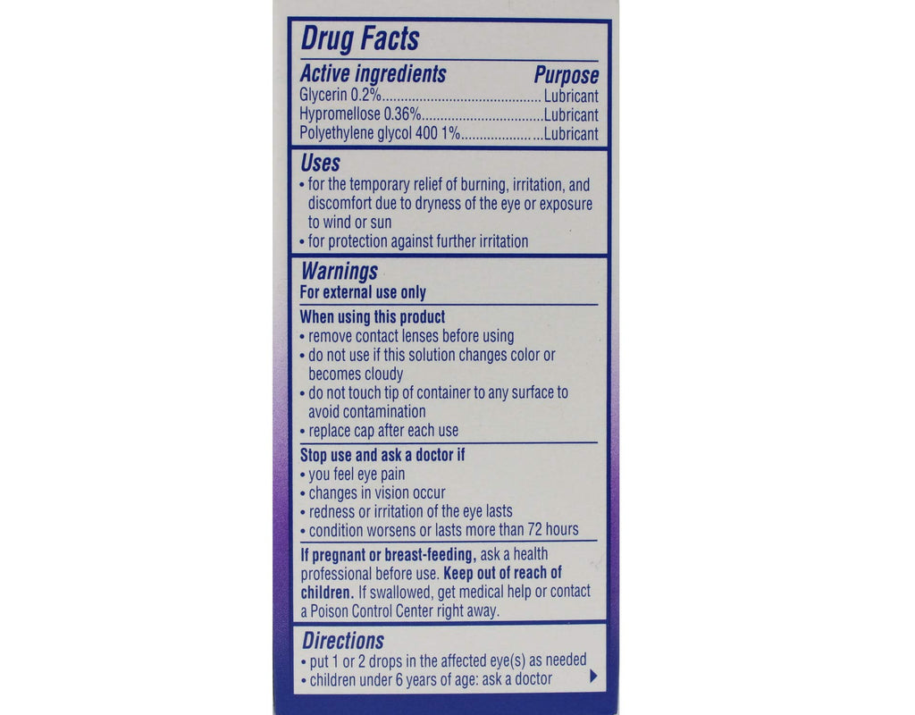 Visine Tired Eye Dry Eye Relief Eye Drops soothe and revive tired, overworked eyes. Made with a unique formula featuring multiple hydrating moisturizers, these eye drops work to protect eyes for up to 10 hours of comfort. They provide relief for burning, irritated, or dry eyes after getting a poor night's sleep, staring at a computer screen for long periods of time, or spending too much time in the wind or sun. From Visine, a brand backed by 60 years of science and expertise, the eye drops are available in a convenient size that easily slips into a bag or purse, so you can soothe your tired eyes anywhere, even on-the-go.