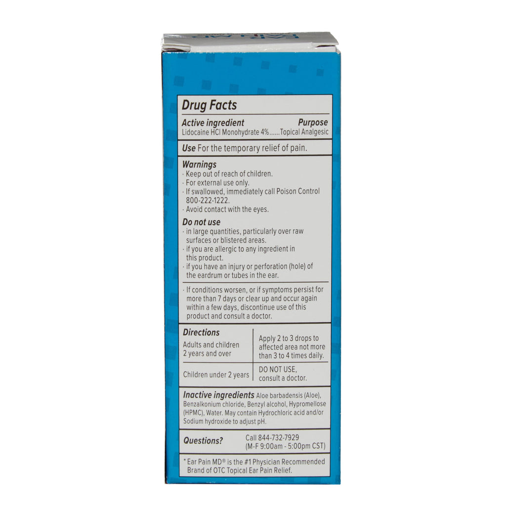 Inside each box, you'll find a 12.5mL bottle of eosera EAR PAIN MD, as well as a child-resistant dropper cap for easy application. Drops for Ear Pain. EAR PAIN MD is your maximum strength pain relief without a prescription for the temporary relief of pain provided numbing relief of 4% lidocaine. Ear pain is a real pain in the ears! Experience the unique benefits of our specialized formula for rapid and targeted temporary relief. For Adults and Kids age 2 and Up. Made in the USA. EAR PAIN MD does not treat the source of infection, your healthcare provider can do that! See product package for additional use instructions and warnings.