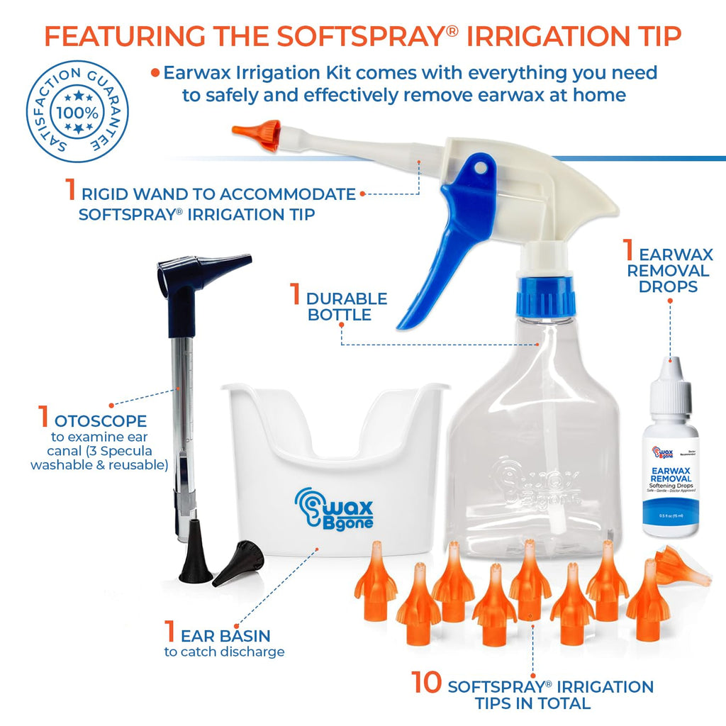 RESEARCH & DEVELOPMENTWaxBgone is a premium ear wash system designed by a Board Certified ENT Physician for safe and effective ear cleaning without the risk of damaging the sensitive eardrum. The exclusive SoftSpray Irrigation Kit is effective at both soft and hard ear wax removal and prevents future buildup with regular use.Relieve symptoms of temporary hearing loss, ringing, itching, pain, plugged ear, and ear wax pressure without an expensive trip to the doctor. The WaxBgone ear lavage kit is ideal for those who wear hearing aids, or regularly use ear buds.PURPOSEFUL DESIGNMany of the ear flushing kits for adults on the market use a needle-like hose that shoots a single high pressure stream of water into the ear canal. This can be uncomfortable and dangerous. In addition, these ear wax cleaner systems do not have any safety device to prevent over-inserting the needle-like hose into the ear canal. WaxBgone ear irrigation system was designed to eliminate these dangers.The SoftSpray Irrigation Tip features a unique Seven-Stream tip that directs water pressure toward the outer walls of the ear canal rather than directly at the eardrum. The gentle 7 stream shower-like spray provides a much safer and more comfortable ear cleaning experience. The flared-end design prevents the possibility of over-inserting the tip, keeping your eardrum safe.TIPS FOR SUCCESSFUL EARWAX IRRIGATION_ Pre-existing hard earwax buildup may require multiple spray bottle refills to remove all earwax, so don't get discouraged._ Depending on the level of blockage, an earwax softening agent can improve success and speed up the process (directions for saving money and making your own ear drops are included in the ear wax cleaning kit)._ Use the included otoscope to examine the ear canal to determine if all earwax has been removed.