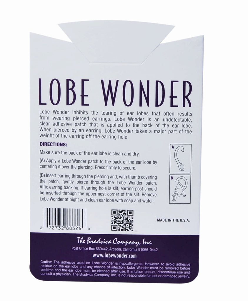 Lobe Wonder Ear Lobe Support Patches For Earrings - 360 Single Use PatchesEarrings weighing your lobes down? Get rid of discomfort and worries caused by enlarged earring holes withLobe Wonder! Our transparent hypoallergenic earlobe patches disguise torn or stretched lobes and provide reliable weight-bearing support to protect ears against further stretching or tearing. Give your favorite earrings a second chance with Lobe Wonder and enjoy more comfort and confidence.Perfect For Any Earring Size or StyleLobe Wonder patches fit snugly and securely around the earring post, preventing ear lobes from stretching or tearing. Despite being flexible and lightweight, these patches are strong enough for the heaviest of earrings.Gentle, Non-Surgical AlternativeUnlike expensive plastic surgery, Lobe Wonder patches are a practical, affordable, non-invasive solution to visibly eliminate the look oof damaged lobes and protect against further tearing of earring holes. Made with hypoallergenic, medical-grade, and latex-free adhesive.Easy To Use, Superior SupportClear and undectable. Lobe Wonders are a breeze to use. For optimal results:Ensure earlobes are clean and dryApply the clear hypoallergenic patch to the back of the ear lobePush the earring through piecing and patch to ensure an invisible, supportive holdRemove earrings and disposablepatches at the end of the day. Clean lobes to avoid adhesive residueUse fresh Lobe Wonders every time you wear earringsThe OriginalBeware of inferior, lower-quality products. Since 1995, Original Lobe Wonder clear hypoallergenic ear lobe support patches have been exclusively manufactured with superior skin-friendly materials in the USA!