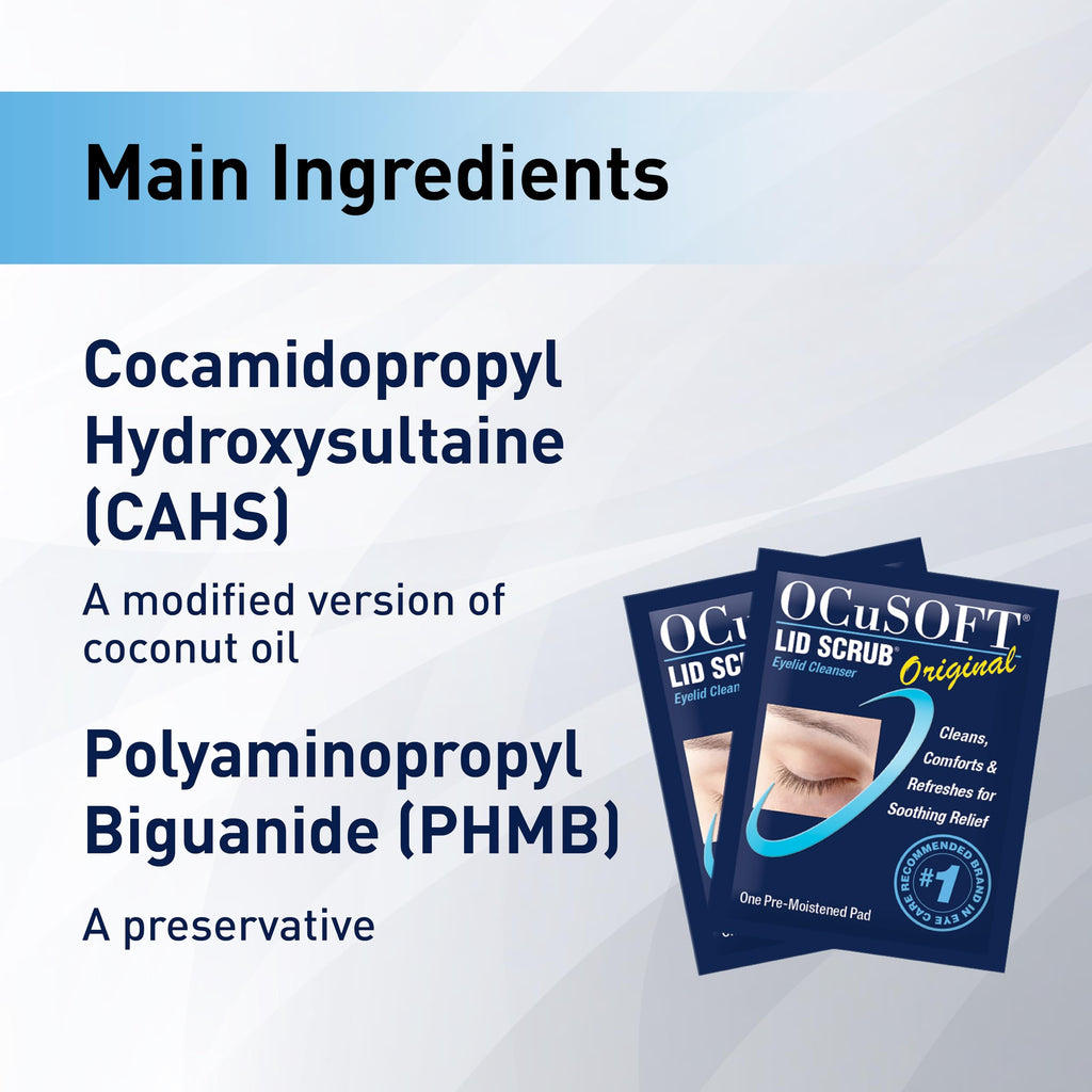 OCuSOFT Lid Scrub Original is a non-irritating formula which effectively removes oil,debris, pollen from the eyelids. It is ideal for daily eyelid hygiene and is specially formulated for irritated eyelids associated with Blepharitis, Dry Eye, Meibomian Gland Dysfunction and Contact Lens Use