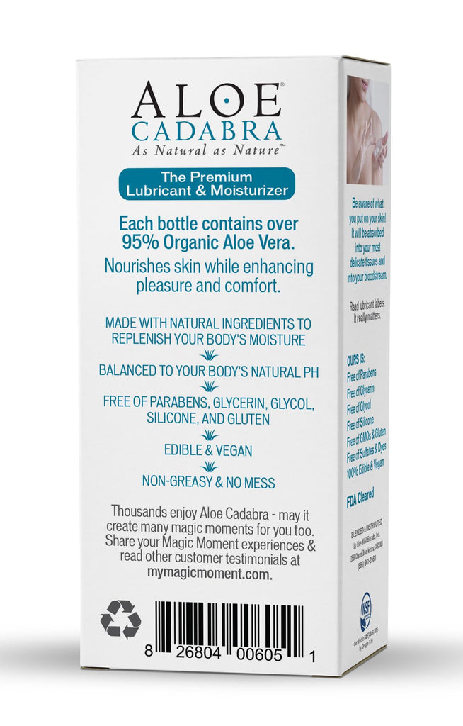 Aloe Cadabra's Natural Aloe Lubricant is a water-based formula made to mimic your body's natural lubrication while moisturizing and invigorating a natural and lasting experience. | pH-BALANCED, vegan, and won't leave you with a burning sensation. Formulated with natural organic ingredients for a comfortable and safe experience. | COMPATIBILE with a wide range of toys, natural rubber, latex and polyisoprene condoms, excluding polyurethane condoms. A versatile and reliable option for intimate moments. | FREE OF Parabens, Petroleum, Silicone, Phenoxyethanol, Glycerin, Glucose, Propylene glycol, or Chlorhexidin.