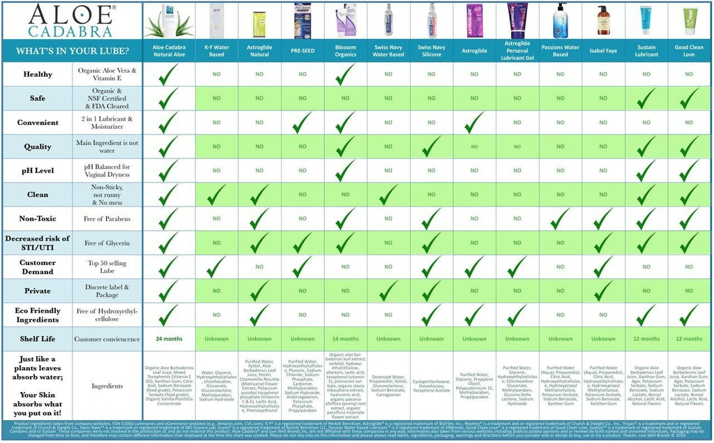 Why is our Product Unique? Aloe Cadabra is a 2-in-1 personal lubricant plus vaginal moisturizer that is certified to NSF organic standards. Our product is made with over 95% organic Aloe Vera and enriched with Vitamin E. It nourishes your skin while enhancing your sexual pleasure and comfort. Why did we create Aloe Cadabra? Aloe Cadabra is about EMPOWERING women. Aloe Cadabra was created not only to educate consumers about these issues with honest products and transparent marketing, but also to provide a genuinely healthy solution. How is it different from what I'm using? While many personal lubricants work by creating a temporary oily or silicone barrier on the surface that can contribute to long-term destruction of vaginal tissue, Aloe Cadabra is designed to moisturize a woman's delicate vaginal tissue to the abundant moisture balance she enjoyed earlier in life. There are no harmful ingredients or adverse side effects! How does Aloe Cadabra work? Aloe Cadabra is pH balanced for a woman's body designed to naturally restore a woman's vaginal environment to its natural state. There is no stickiness or staining, ust moisture-replenished, youth recaptured, magic restored. Is it fun and safe to use with toys? Aloe Cadabra comes in four different flavors and scents and is safe for most condoms and toys. While silicone-based lubricants can degrade both silicone and jelly rubber toys, Aloe Cadabra won't hurt them at all. It does not wear down or damage common materials like silicone, glass, and latex.