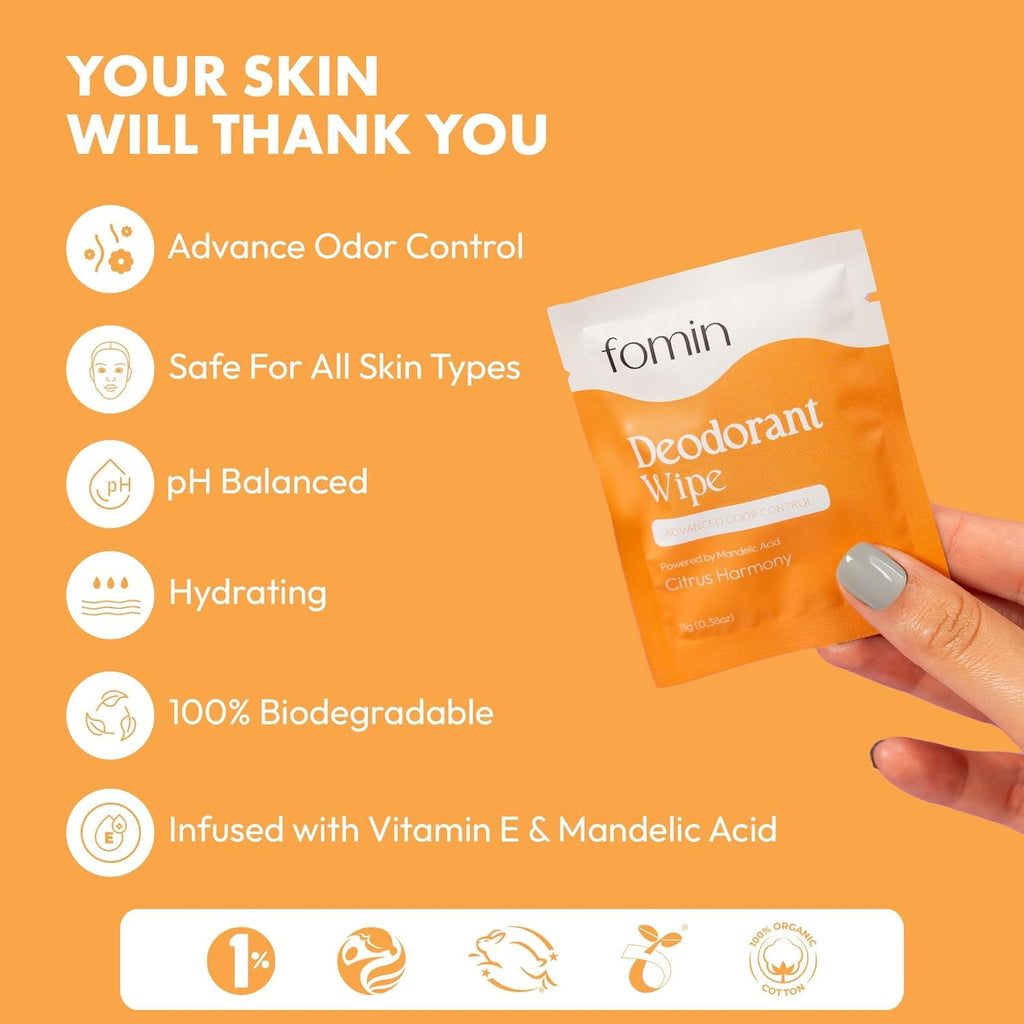 Step into a world of effortless freshness with Fomin Deodorant Wipes For Women and Men. Imagine a product designed to be your discreet yet powerful companion throughout the day, delivering confidence with every swipe. Crafted for those on the go, these body wipes bring you the refreshing touch of nature, packed in eco-friendly, individually wrapped parcels that fit snugly in your bag, gym locker, or pocket. Whether you're tackling a busy workday, finishing a workout, or simply looking to feel revitalized, Fomin Underarm Deodorant Wipes offer an instant escape from sweat and odor, leaving you refreshed and ready to conquer anything life throws your way.Infused with vitamin E, mandelic acid and natural skin loving ingredients, these wipes not only neutralize odor but also leave your skin feeling soft, clean, and moisturized. The subtle fragrance adds just the right touch of elegance, making you feel as fresh as a morning breeze. With FOMIN, freshness becomes a lifestyle your perfect companion for every adventure.