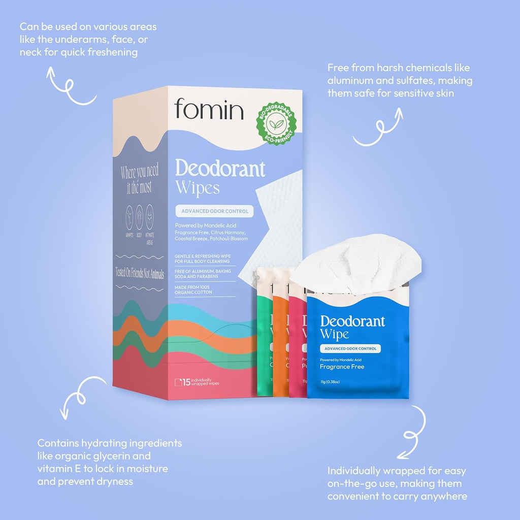 • Q: Do FOMIN deodorant wipes contain any harsh chemicals? A: FOMIN deodorant wipes are infused with natural skin-loving ingredients, including vitamin E and mandelic acid, and are free from harsh chemicals.