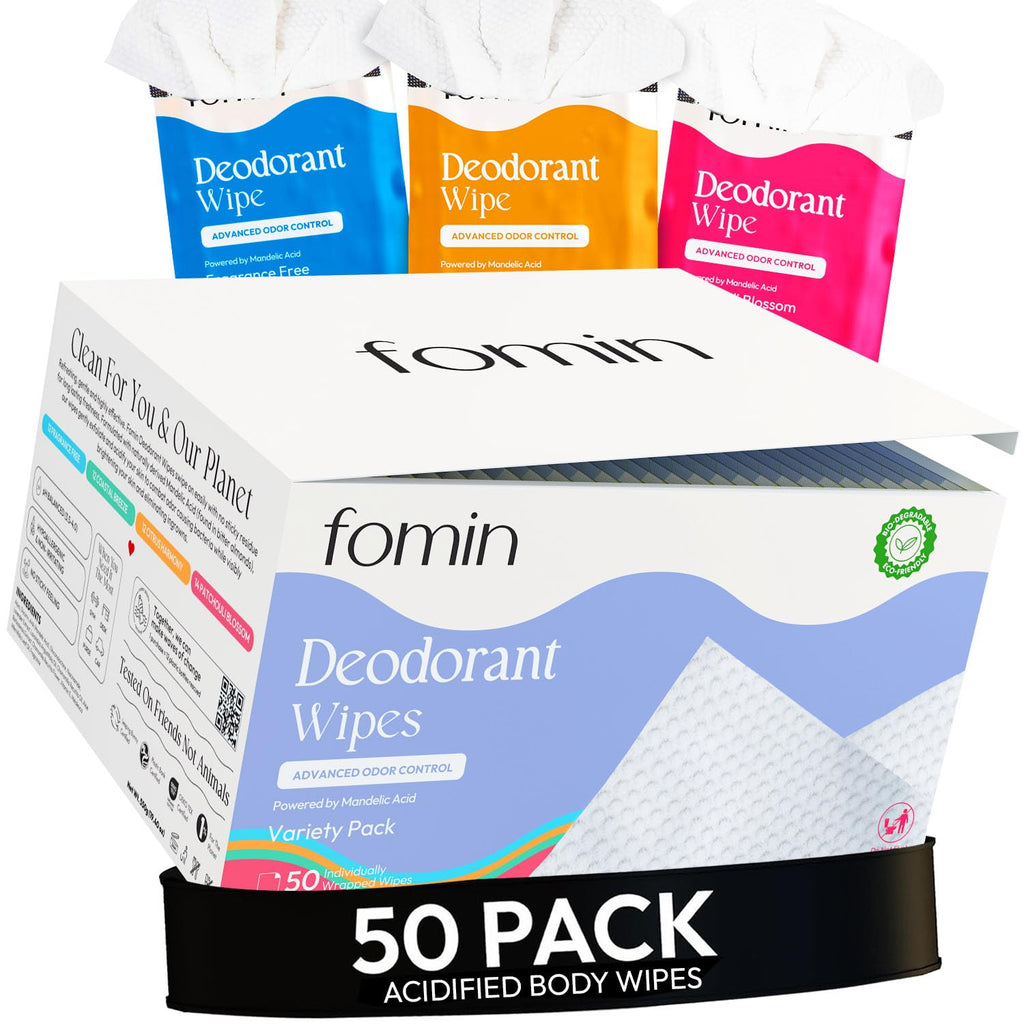 • Q: What is the size of the FOMIN deodorant wipes pack? A: The FOMIN deodorant wipes pack contains 50 individually wrapped wipes, perfect for travel and everyday use.