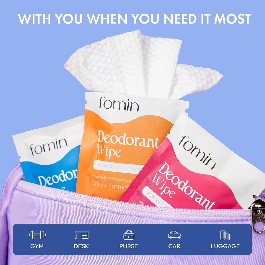 • Q: How do I use FOMIN deodorant wipes? A: To use FOMIN deodorant wipes, simply take one individually wrapped wipe, open it, and swipe it over your underarms or any other body part where you want to remove sweat.