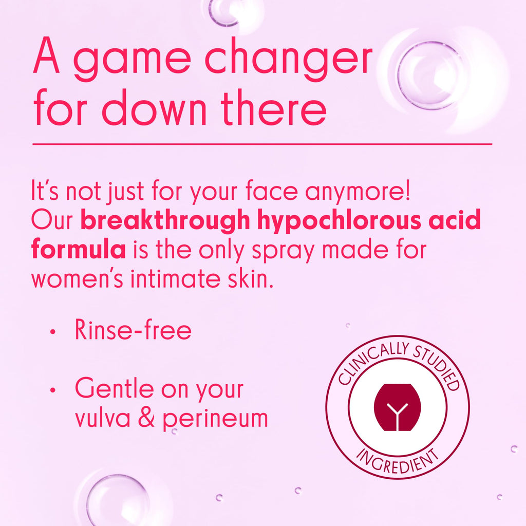Intimate Skin Support Spray has FDA-cleared hypochlorous acid. It's pH-balanced, free of many harmful substances, relieves odor/itch without harsh chemicals, needs no rinse. As a feminine hygiene solution, it's for sensitive skin, daily use, protecting intimate health and defending against UTIs, odor, and itch.