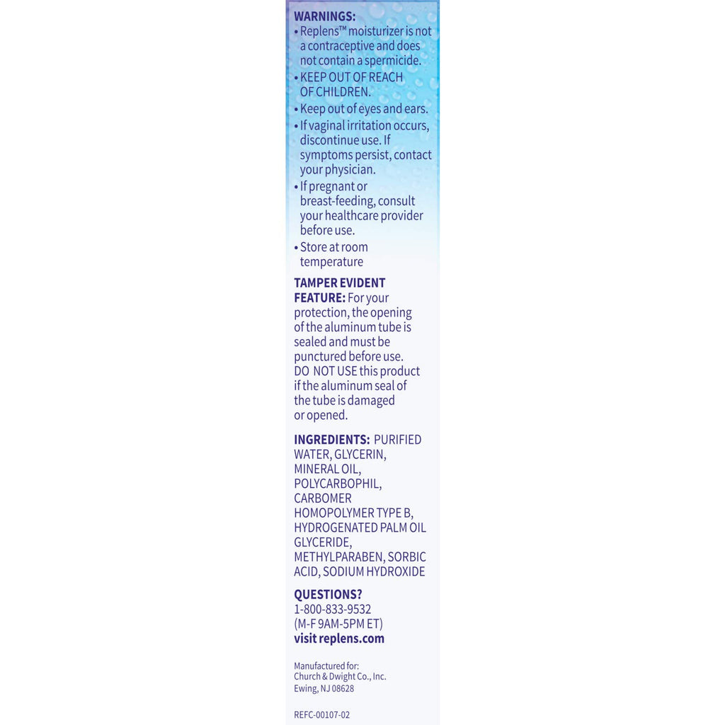 Must be 18 years of age or older to purchase. Estrogen Free br Why Try Replens? Replenishes Vaginal Moisture 1 Rejuvenates and Restores 4 Lasts For Days 3 Less Mess ~ Unique Adhesive Formula Clinically Tested | Gynecologist Recommended Why Try? Is Replens Right for Me? br Gynecologists have long recommended Replens Long-Lasting Feminine Moisturizer to their patients as one of the most effective ways to address vaginal dryness. Replens has been shown to be effective in multiple clinical studies and has been recommended in both prestigious medical journals and popular women s magazines. Top 5 Reasons to Try Replens Long-Lasting Feminine Moisturizer Replens is a vaginal moisturizer, delivering moisture for days, allowing you the freedom to be spontaneous, making intimacy more enjoyable day or night.
