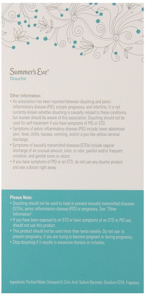 Refresh and revitalize with Summer 's Eve Douche Fresh Scent. Designed for gentle cleansing, our douche provides a feeling of cleanliness and confidence every day. With a light, fresh scent, this 4.5 oz solution helps maintain your natural pH balance while leaving you feeling clean and comfortable. Summer 's Eve Douche is gynecologist-tested and hypoallergenic, ensuring safety and efficacy for your intimate hygiene needs. Elevate your freshness and embrace the confidence of Summer 's Eve Douche Fresh Scent.
