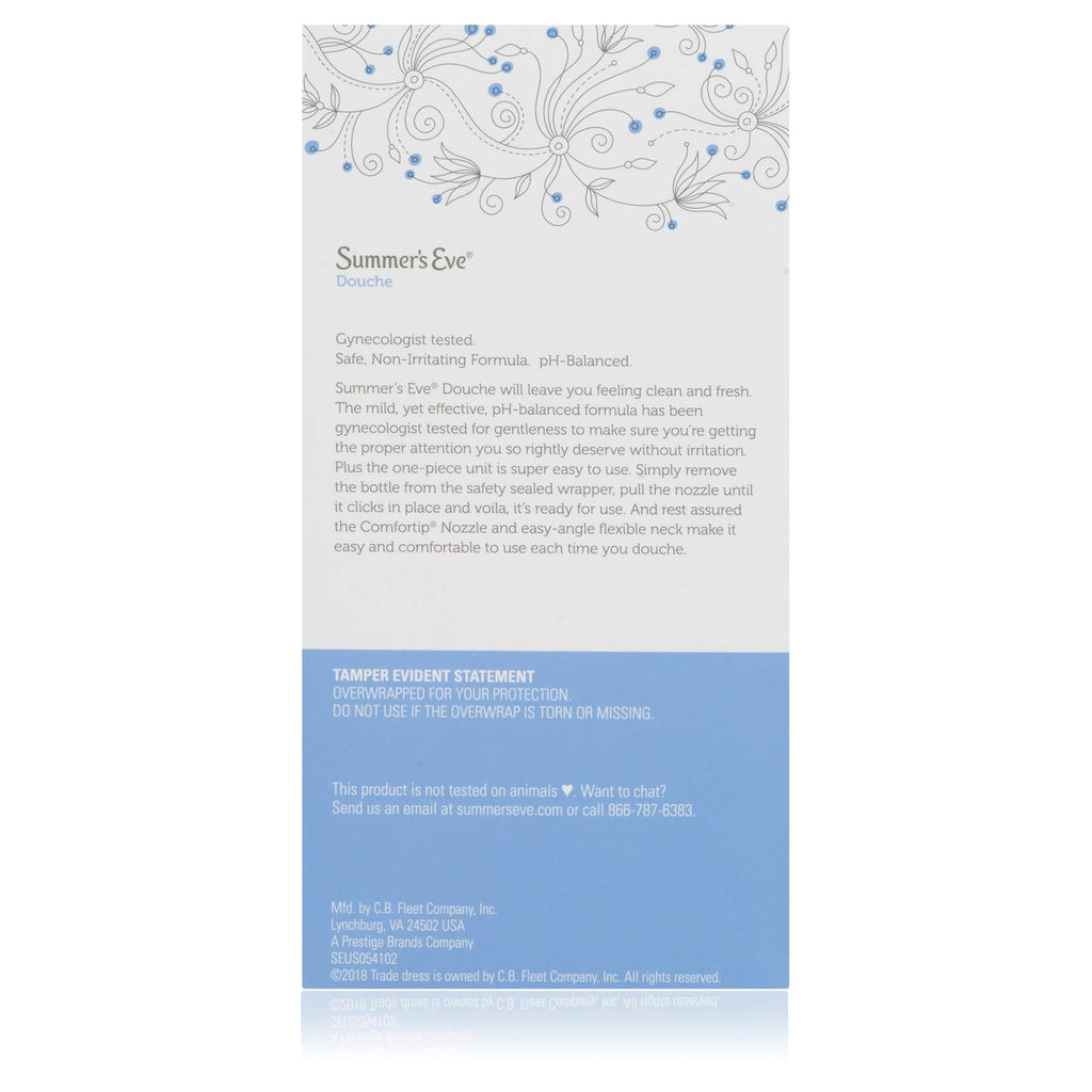 Summer 's Eve Feminine Douche will leave you feeling clean and fresh. The mild, yet effective, pH-balanced formula has been gynecologist-tested for gentleness to make sure you 're getting the proper attention you so rightly deserve. To use, remove the bottle from the safety-sealed wrapper, pull the nozzle until it clicks in place and voila, it 's ready. And rest assured the Comfortip Nozzle and easy-angle flexible neck make it easy and comfortable to use. All Summer 's Eve products - along with every unique scent - are gynecologist-tested to ensure they are safe, even for sensitive skin. Summer 's Eve Feminine Douches are available in a variety of scents and sizes. Be sure to check out Summer 's Eve Feminine Cleansing Washes and Cleansing Cloths for all your feminine cleansing needs.