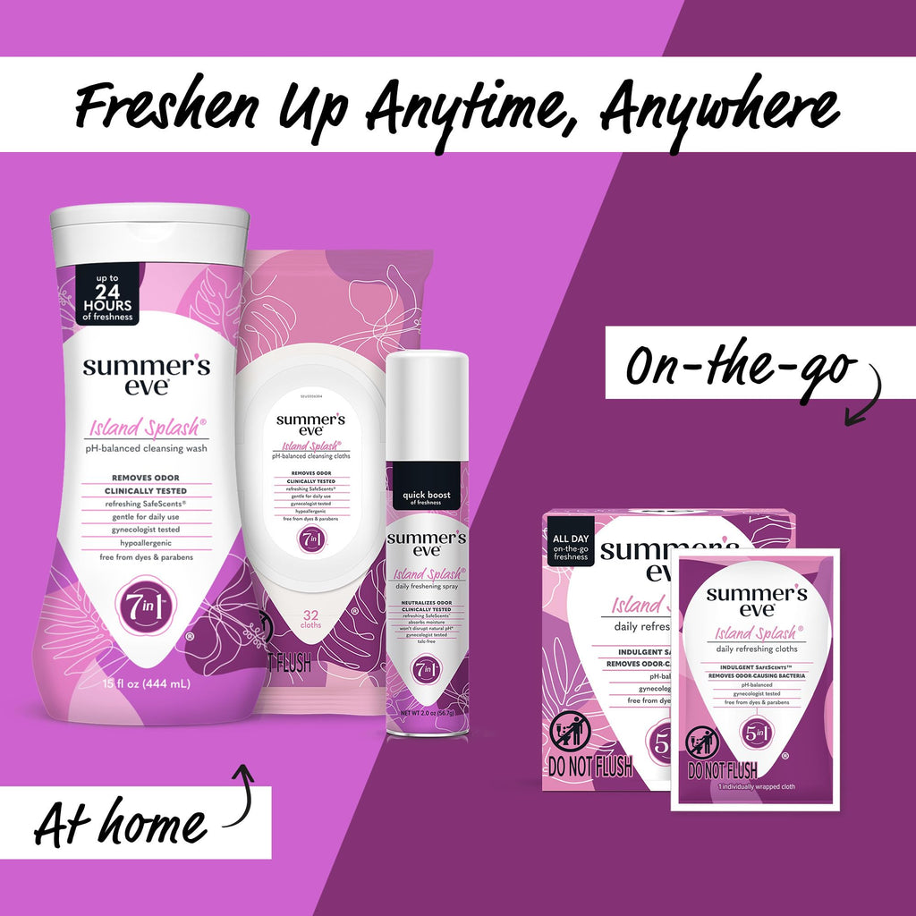 A refreshing, cleansing experience for your intimate area so you can take on anything. Summer 's Eve Refreshing feminine care products comes in a variety of indulgent SafeScents letting you experience that unique, everyday Summers Eve readiness. Summer 's Eve Feminine Body Wash is created for your most intimate areas to gently cleanse away the bacteria that can cause odor. Uniquely formulated and pH-balanced to match your body 's natural chemistry. All Summer 's Eve feminine hygiene products, along with every unique scent, are gynecologist tested to ensure they are safe, even for sensitive skin. Island Splash indulgent SafeScent is a rich and sensual fragrance and gentle enough for your most delicate skin. Thats why millions of women trust our expansive range of gynecologist-tested cleansing and care. Our wide variety of products are made for everybody - whether youre at home or on the go, want to bask in fragrant lusciousness or no scent at all or want ultra-Refreshing or high performance. With every Summers Eve product you use, know that We See You, We Get You, We Got You. Sunburn Alert: This product contains an alpha hydroxy acid (AHA) that may increase your skin 's sensitivity to the sun and particularly the possibility of sunburn. Use a sunscreen, wear protective clothing, and limit sun exposure while using this product and for a week afterwards.