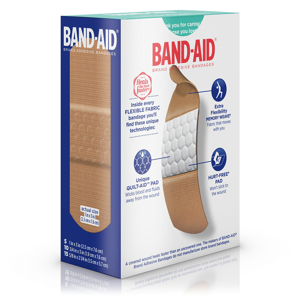 Heals the hurt faster(TM). Inside every Flexible Fabric bandage you'll find these unique technologies: Extra Flexibility, unique Memory Weave(TM) fabric that moves with you. Non-Stick Pad, Hurt-Free(TM) Pad that won't stick to the wound for gentle removal. Full-Width Pad; Full-width pad designed to fit more wounds. A covered wound heals faster than an uncovered one. The makers of Band-Aid(R) Brand do not manufacture store brand products.