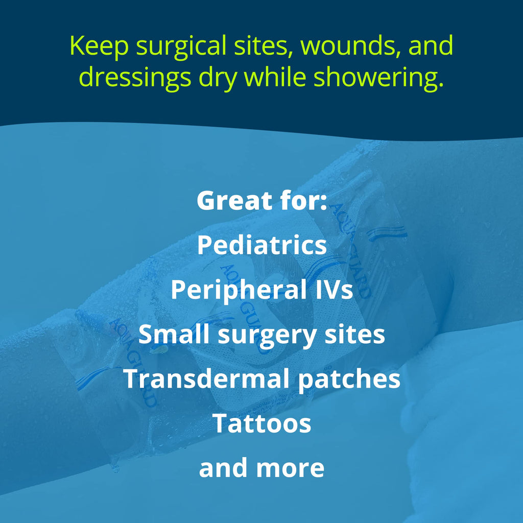 • Q: What are the primary uses of the AquaGuard Sheet? A: The AquaGuard Sheet is primarily used to protect small surgical sites, wounds, dressings, PICC lines, and tattoos from moisture while showering.