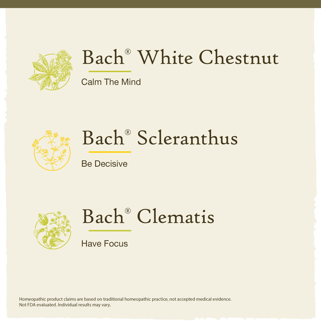 Have Clarity of Mind. Take a breath. Be mindful in the moment. Contains 3 full-size Bach Original Flower Remedies: White Chestnut, Scleranthus, Clematis. Can be taken individually (approximately 380 doses per bottle), or as a blend.Covered by the Nelsons 45-Day Satisfaction Guarantee. If you are not satisfied with your Bach or Rescue product purchased from its authorized seller, you may request a refund or replacement product. Because Nelsons is unable to control the quality of products sold by unauthorized sellers, unless otherwise prohibited by law, the Guarantee is not available for products purchased from unauthorized sellers. The Guarantee applies only to original, end-user purchaser in the United States. Guarantee claim must be made within 45 days of purchase. You are required to furnish proof of purchase. Nelsons reserves the right to deny guarantee coverage in cases of suspected fraud or abuse.