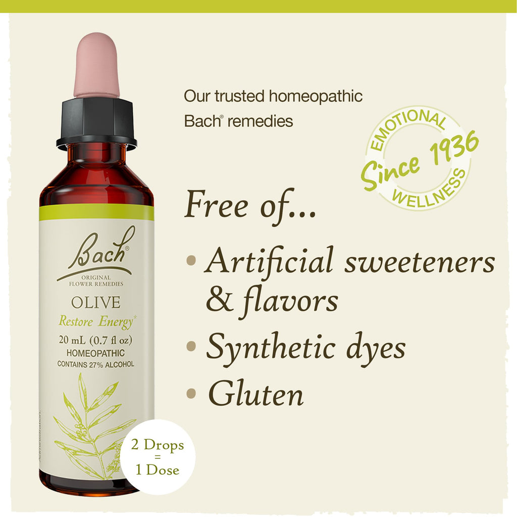 Restore Energy. The Bach remedy Olive encourages the positive potential to revitalize yourself after making an effort. For times when all reserves of inner strength and energy have run out. Let go and allow yourself to revitalize and restore your mental energy.Covered by the Nelsons 45-Day Satisfaction Guarantee. If you are not satisfied with your Bach or Rescue product purchased from its authorized seller, you may request a refund or replacement product. Because Nelsons is unable to control the quality of products sold by unauthorized sellers, unless otherwise prohibited by law, the Guarantee is not available for products purchased from unauthorized sellers. The Guarantee applies only to original, end-user purchaser in the United States. Guarantee claim must be made within 45 days of purchase. You are required to furnish proof of purchase. Nelsons reserves the right to deny guarantee coverage in cases of suspected fraud or abuse.