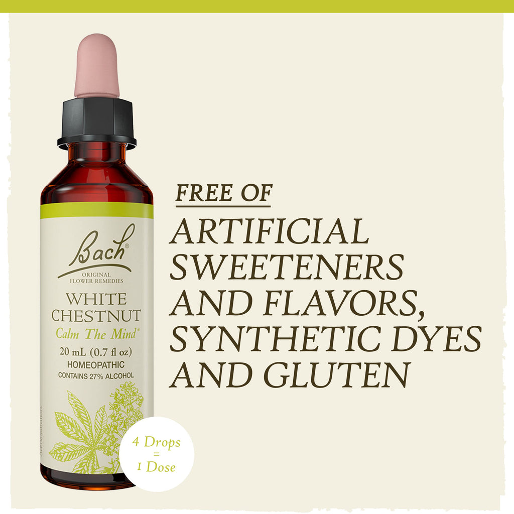 Calm The Mind. The Bach remedy White Chestnut encourages the positive potential to find tranquility and peace of mind. Dont let those repetitive thoughts cloud your mind and get in the way of your focus. Reclaim your day and cope with the hectic world around you.Covered by the Nelsons 45-Day Satisfaction Guarantee. If you are not satisfied with your Bach or Rescue product purchased from its authorized seller, you may request a refund or replacement product. Because Nelsons is unable to control the quality of products sold by unauthorized sellers, unless otherwise prohibited by law, the Guarantee is not available for products purchased from unauthorized sellers. The Guarantee applies only to original, end-user purchaser in the United States. Guarantee claim must be made within 45 days of purchase. You are required to furnish proof of purchase. Nelsons reserves the right to deny guarantee coverage in cases of suspected fraud or abuse.
