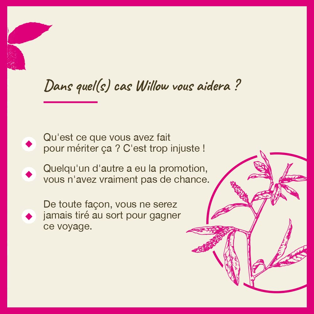 Forgive & Forget. The Bach flower remedy Willow encourages the positive potential to forgive and forget past injustices and enjoy life. Combat negativity, the consequences of resentment, and regain a sense of humor when life presents shortcomings. Dont be a victim, control your own destiny.Covered by the Nelsons 45-Day Satisfaction Guarantee. If you are not satisfied with your Bach or Rescue product purchased from its authorized seller, you may request a refund or replacement product. Because Nelsons is unable to control the quality of products sold by unauthorized sellers, unless otherwise prohibited by law, the Guarantee is not available for products purchased from unauthorized sellers. The Guarantee applies only to original, end-user purchaser in the United States. Guarantee claim must be made within 45 days of purchase. You are required to furnish proof of purchase. Nelsons reserves the right to deny guarantee coverage in cases of suspected fraud or abuse.