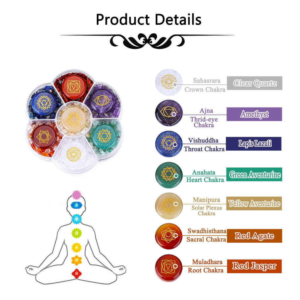 CrystalTears 7 Chakra Crystal Stones Natural Reiki Healing Crystals Gemstones with Engraved Chakra Symbol Tumbled Polished Chakra Stone Kit for Meditation Crystal TherapyChakra Crystal Specifications:Size: circle chakra stones: 0.98-1.02 inches/pcs; plastic box: 3.94 inches in length and widthMaterial: natural 7 chakra crystals, include amethyst, clear quartz, lapis lazuli, green aventurine, yellow aventurine, red agate, red jasperWeight: 155gPackage: 1x chakra crystal stone setChakra Healing Crystals Gemstone: a body with a fine energy structure, descrided as Chakra(energy center) in a sanskrit word. Each spiritual colored energy healing gemstone is strongly connected with a specific Chakra to raise your vibration and to emit positive flow of energy.Clear Quartz(crown chakra),Amethyst(third-eye chakra),Lapsi Lazuli (throat chakra), Green Aventurine(heart chakra), yellow aventurine(solar plexus chakra), Red Agate(sacral chakra), Red Jasper(Root Chakra)Best Gift:The energy stone is good for energy balancing, meditation, crystal therapy, reiki healing. Connecting with the chakra to raise vibration and emit positive energy, make a good impact on physical and mental.Perfect gift for for those who are just beginning to experiment with healing crystals, yoga lover, crystal gemstone collectorPlease Note:Due to the nature of gemstone, carving may slightly vary in size, colo and shapeIf you have any question about your healing crystal purchased, welcome to contact with us, we will try our best to serve for you