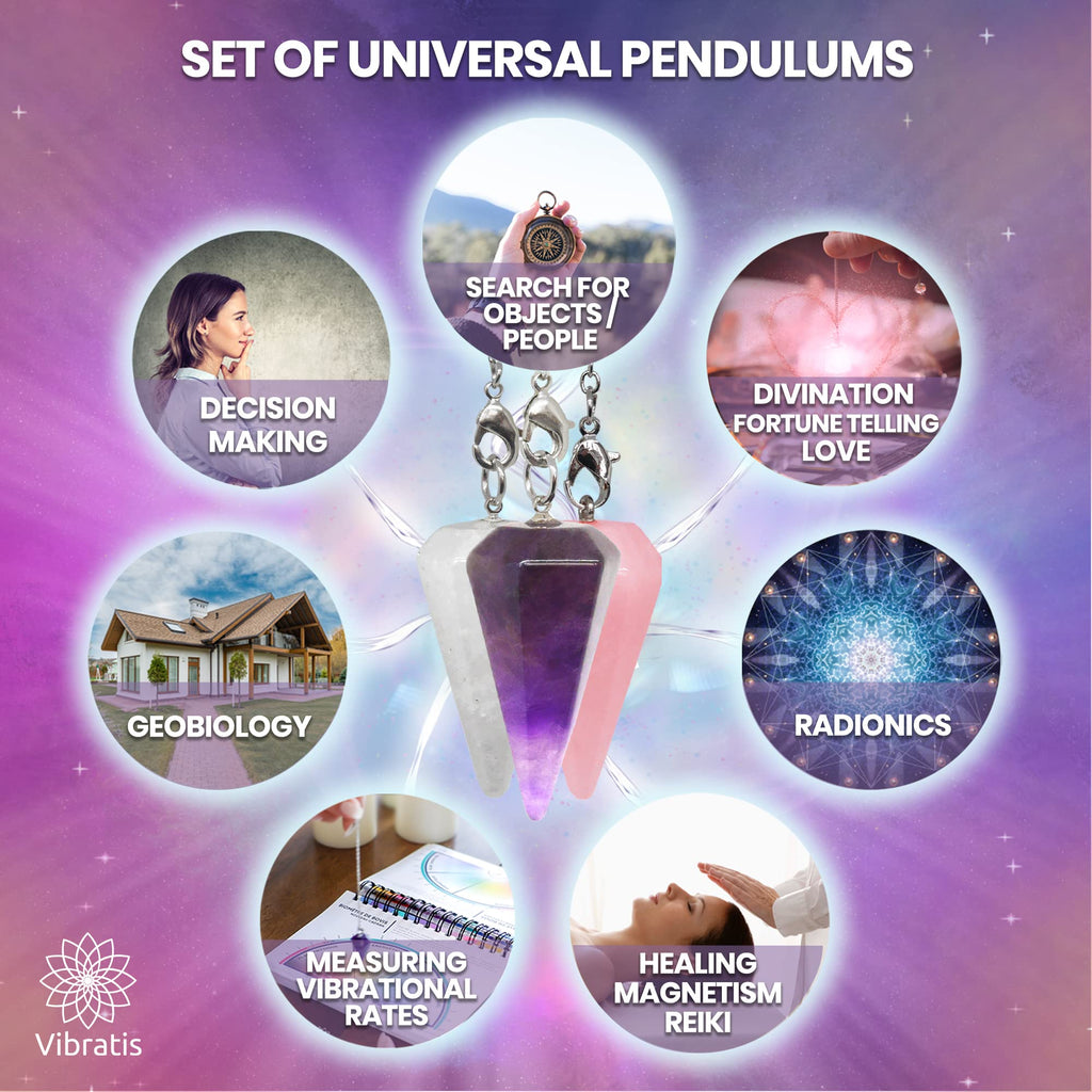 ?? SET OF 3 DOWSING CRYSTAL PENDULUMS IN ROSE QUARTZ, AMETHYST, ROCK CRYSTAL: dowsing pendulum in Rose Quartz, Amethyst and Rock Crystal ? DOWSING PENDULUM: pendulum enclosed in a very lovely VELVET BLACK BAG. ?? Ideal pendulum for Beginners due to its lightweight nature ?? ?? PENDULUM is tested and approved by our team of Experienced Dowsers. Our dowsing pendulum is universal and thus suitable for all types of practices: REIKI, MAGNETISM, GEOBIOLOGY, ASTROLOGY, DIVINATION & FORTUNE-TELLING ?? COMMITMENT TO THE ENVIRONMENT: 1% of proceeds are donated to our REFORESTATION PROGRAM with our NGO partner. This offsets the carbon emissions associated with shipping and aids in the fight against the destruction of our beautiful planets lungs ?? ?? LIFETIME SATISFACTION GUARANTEE: our pendulum comes with a LIFETIME SATISFACTION GUARANTEED. Our products have been selected with the greatest care by our team of dowsers, diviners, and magnetizers. 24/7 customer service available by email.