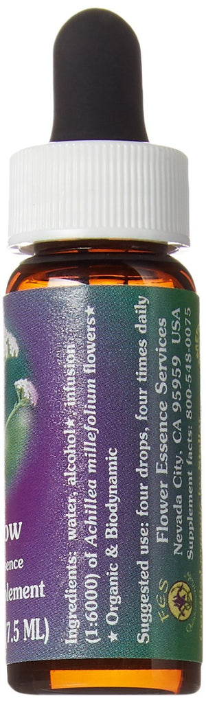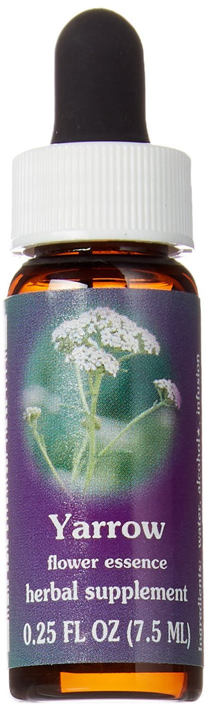 Yarrow dropper by flower essence services 0.25 oz liquid yarrow dropper 0.25 oz liquid positive qualities inner radiance and strength of aura compassionate awareness inclusive sensitivity beneficent healing forces. Patterns of imbalance extreme vulnerability to others and to the environment easily depleted overly absorbent of negative influences psychic toxicity. Suggested use as a dietary supplement add 2 drops to water and take 4 times daily.-or as directed by your healthcare professional. Other ingredients brandy water infusion of yarrow flowers. 40 alcohol. Meets 1990 calif. Organic act. Demeter-certified biodynamic warnings keep out of reach of children. As with all dietary supplements consult your healthcare professional before use. See product label for more information.