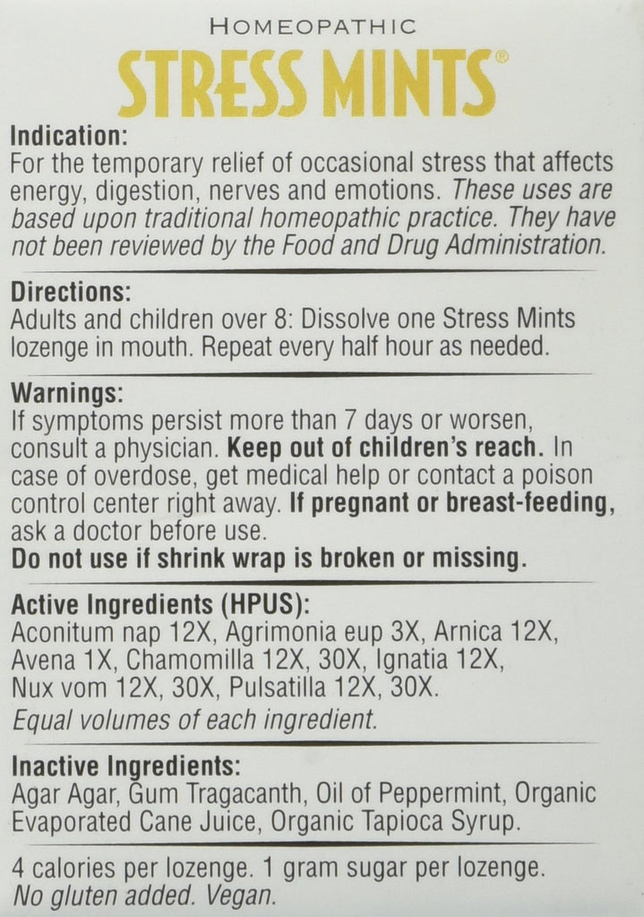 Historical Remedies Homeopathic Stress Mints. Description: Historical Remedies. Stress Mints. Relax in a New York Minute. 30 Homeopathic Stress Lozenges. The multi-dimensional nature of stress is factored into the Stress Mints formulation. The result is lozenge that counter-acts the effects of day-to-day stress as it relates to energy, digestion, travel, nerves and mental functions. Contains 30 lozenges. Natural Peppermint flavor. Disclaimer: These statements have not been evaluated by the FDA. These products are not intended to diagnose, treat, cure, or prevent any disease.