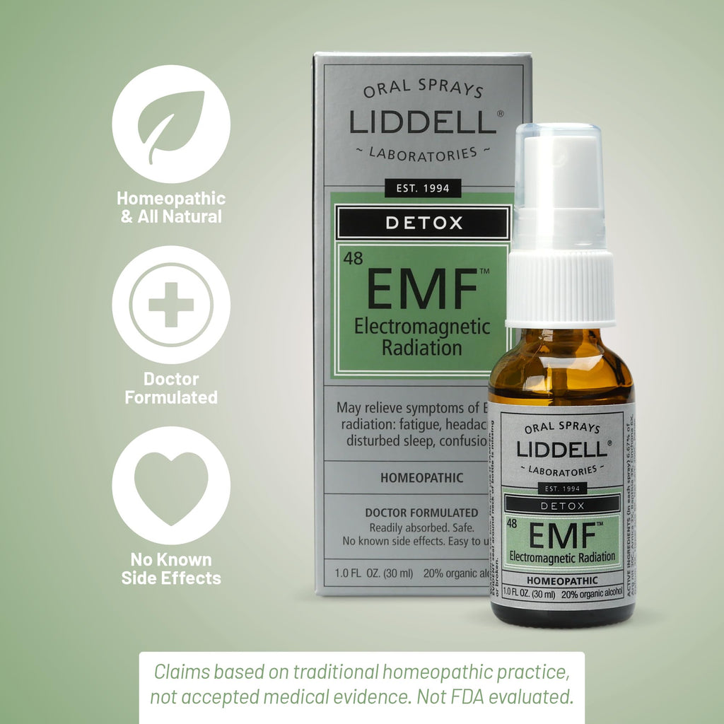 Liddell Homeopathic Anti-Tox Electromagnetic EMF Radiation. Description: Detoxifies the body and temporarily relieves symptoms of electromagnetic (EMF) radiation, such as: Recurring fatigue. Disturbed sleep. Frequent headaches. Mental confusion. Nausea Detox. EMF counteracts the ill effects of radiation from computers, cell phones, television sets, power lines, household appliances, etc. Detox EMF restores mental and physical vitality, as well as clears the mind, relieves nausea and irritability. This homeopathic remedy detoxifies the body by stimulating the principal organs of elimination: the liver, kidneys, and bladder. Disclaimer These statements have not been evaluated by the FDA. These products are not intended to diagnose, treat, cure, or prevent any disease.