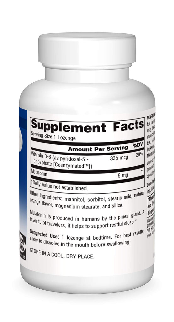 'Melatonin is produced in humans by the pineal gland. A favorite of travelers, it helps support restful sleep.*'' | ''Suggested Use: 1 lozenge at bedtime. For best results, allow to dissolve in the mouth before swallowing.'' | ''5 mg Orange Lozenge Option Available: 50, 100, 200'' | Over 40 Years of Trust. Source Naturals was created in 1982 by CEO Ira Goldberg to support everyone