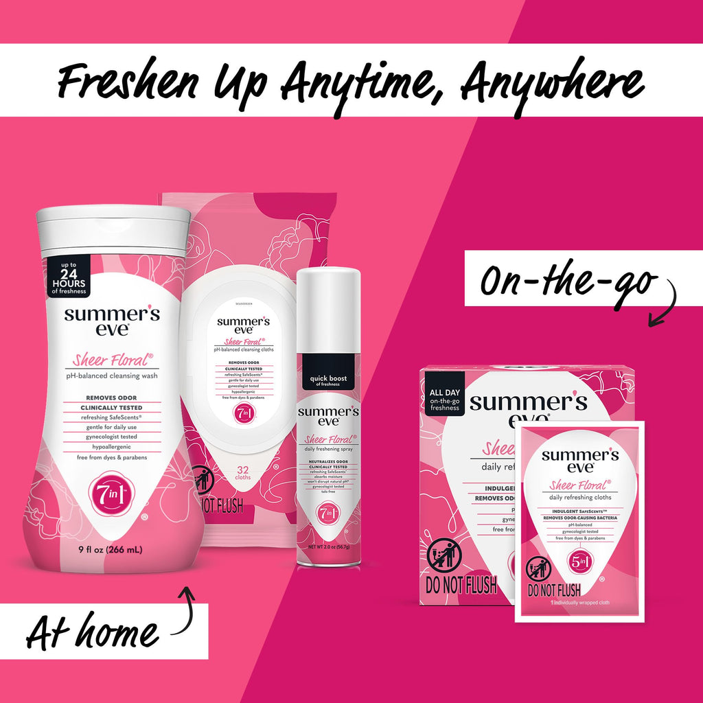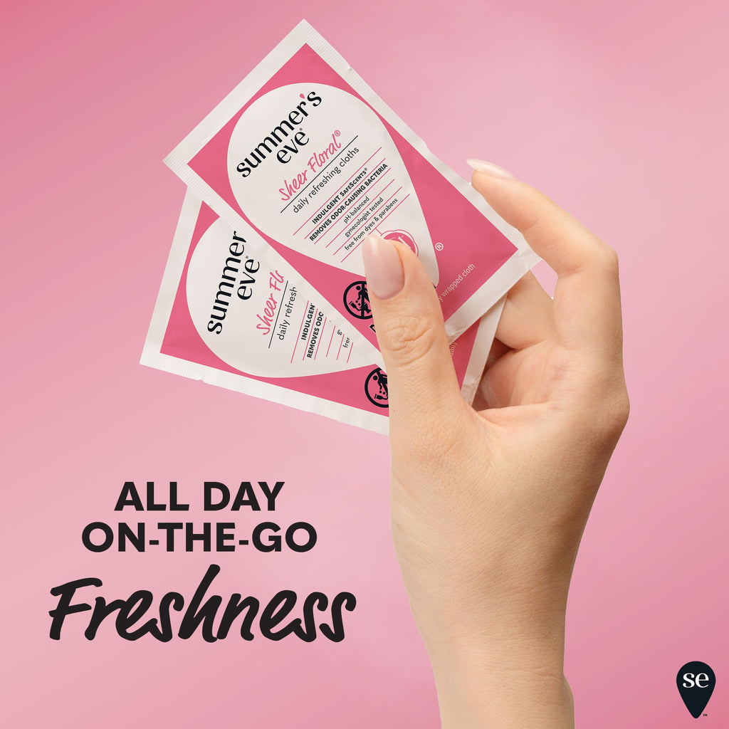 A refreshing, cleansing experience for your intimate area so you can take on anything. Summer's Eve Refreshing feminine care products comes in a variety of indulgent SafeScents letting you experience that unique, everyday Summers Eve readiness. Summer's Eve Feminine wipes are created for your most intimate areas to gently cleanse away the bacteria that can cause odor. Sheer Floral indulgent SafeScent is inspired by spring flowers and gentle enough for your most delicate skin. Uniquely formulated and pH-balanced to match your body's natural chemistry. All Summer's Eve feminine hygiene products, along with every unique scent, are gynecologist tested to ensure they are safe, even for sensitive skin. Thats why millions of women trust our expansive range of gynecologist-tested cleansing and care. Our wide variety of products are made for everybody - whether youre at home or on the go, want to bask in fragrant lusciousness or no scent at all or want ultra-gentle or high performance. With every Summers Eve product you use, know that We See You, We Get You, We Got You.